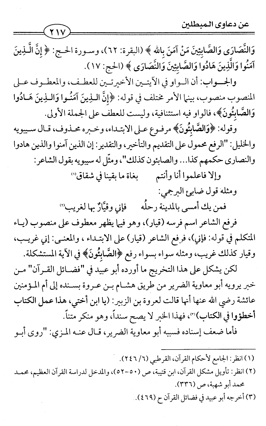 وَالنَّصَارَى وَالصَّابِئِينَ مَنْ آمَنَ بِالله} (البقرة: 62)، وسورة الحج: {إِنَّ الَّذِينَ آمَنُوا وَالَّذِينَ هَادُوا وَالصَّابِئِينَ وَالنَّصَارَى} (الحج: 17).