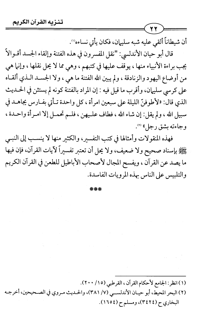 قال أبو حيان الأندلسي: "نقل المفسرون في هذه الفتنة وإلقاء الجسد أقوالاً يجب براءة الأنبياء منها، يوقف عليها في كتبهم، وهي مما لا يحل نقلها، وإنما هي من أوضاع اليهود والزنادقة، ولم يبين الله الفتنة ما هي، ولا الجسد الذي ألقاه على كرسي سليمان، وأقرب ما قيل فيه: إن المراد بالفتنة كونه لم يستثن في الحديث الذي قال: «لأطوفنّ الليلة على سبعين امرأة، كل واحدة تأتي بفارس يجاهد في سبيل الله، ولم يقل: إن شاء الله، فطاف عليهن، فلم تحمل إلا امرأة واحدة، وجاءته بشق رجل» (¬2).