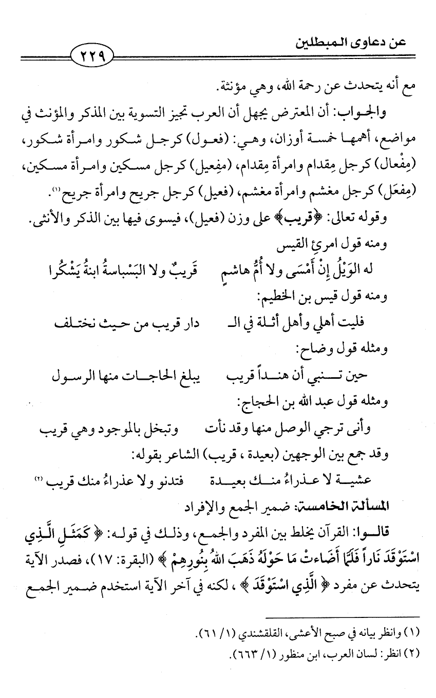 والجواب: أن المعترض يجهل أن العرب تجيز التسوية بين المذكر والمؤنث في مواضع، أهمها خمسة أوزان، وهي: (فعول) كرجل شكور وامرأة شكور، (مِفْعال) كرجل مِقدام وامرأة مِقدام، (مفِعيل) كرجل مسكين وامرأة مسكين، (مِفعَل) كرجل مغشم وامرأة مغشم، (فعيل) كرجل جريح وامرأة جريح (¬1).