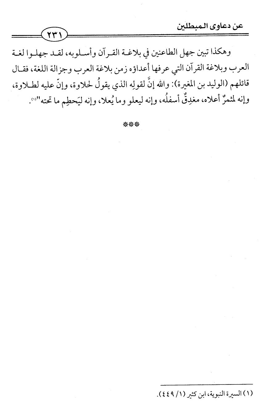 ومن ذلك كله تبين جهل الطاعنين في بلاغة القرآن وأسلوبه، لقد جهلوا لغة العرب وبلاغة القرآن التي عرفها أعداؤه زمن بلاغة العرب وجزالة اللغة، فقال قائلهم (الوليد بن المغيرة): والله إنَّ لقولِه الذي يقولُ لحلاوة، وإنّ عليه لطلاوة، وإنه لمثمرٌ أعلاه، مغدِقٌ أسفلُه، وإنه ليعلو وما يُعلا، وإنه ليَحطِم ما تحته" (¬1).