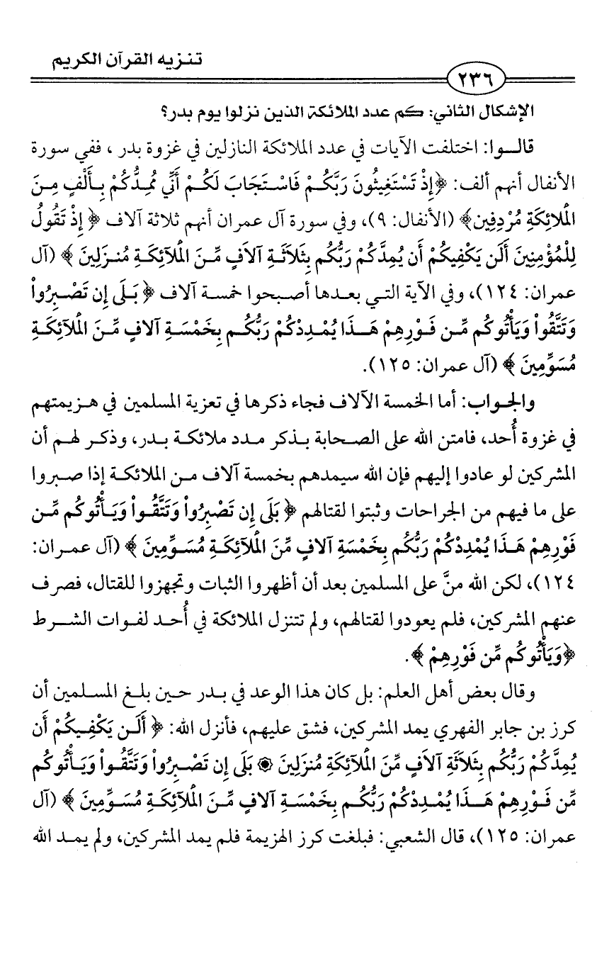 قالوا: اختلفت الآيات في عدد الملائكة النازلين في غزوة بدر، ففي سورة الأنفال أنهم ألف: {إِذْ تَسْتَغِيثُونَ رَبَّكُمْ فَاسْتَجَابَ لَكُمْ أَنِّي مُمِدُّكُمْ بِأَلْفٍ مِنَ الْمَلائِكَةِ مُرْدِفِين} (الأنفال: 9)، وفي سورة آل عمران أنهم ثلاثة آلاف {إِذْ تَقُولُ لِلْمُؤْمِنِينَ أَلَن يَكْفِيكُمْ أَن يُمِدَّكُمْ رَبُّكُم بِثَلاَثَةِ آلاَفٍ مِّنَ الْمَلآئِكَةِ مُنزَلِينَ} (آل عمران: 124)، وفي الآية التي بعدها أصبحوا خمسة آلاف {بَلَى إِن تَصْبِرُوا وَتَتَّقُوا وَيَأْتُوكُم مِّن فَوْرِهِمْ هَذَا يُمْدِدْكُمْ رَبُّكُم بِخَمْسَةِ آلافٍ مِّنَ الْمَلآئِكَةِ مُسَوِّمِينَ} (آل عمران: 125).