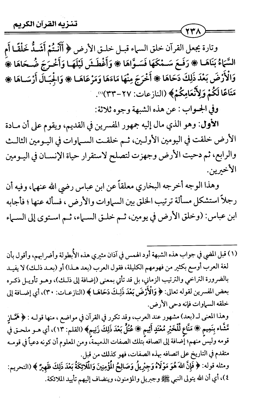 وتارة يجعل القرآن خلق السماء قبل خلق الأرض {أَأَنْتُمْ أَشَدُّ خَلْقًا أَمِ السَّمَاءُ بَنَاهَا رَفَعَ سَمْكَهَا فَسَوَّاهَا وَأَغْطَشَ لَيْلَهَا وَأَخْرَجَ ضُحَاهَا وَالْأَرْضَ بَعْدَ ذَلِكَ دَحَاهَا أَخْرَجَ مِنْهَا مَاءَهَا وَمَرْعَاهَا وَالْجِبَالَ أَرْسَاهَا مَتَاعًا لَكُمْ وَلِأَنْعَامِكُمْ} (النازعات: 27 - 33) (¬1).