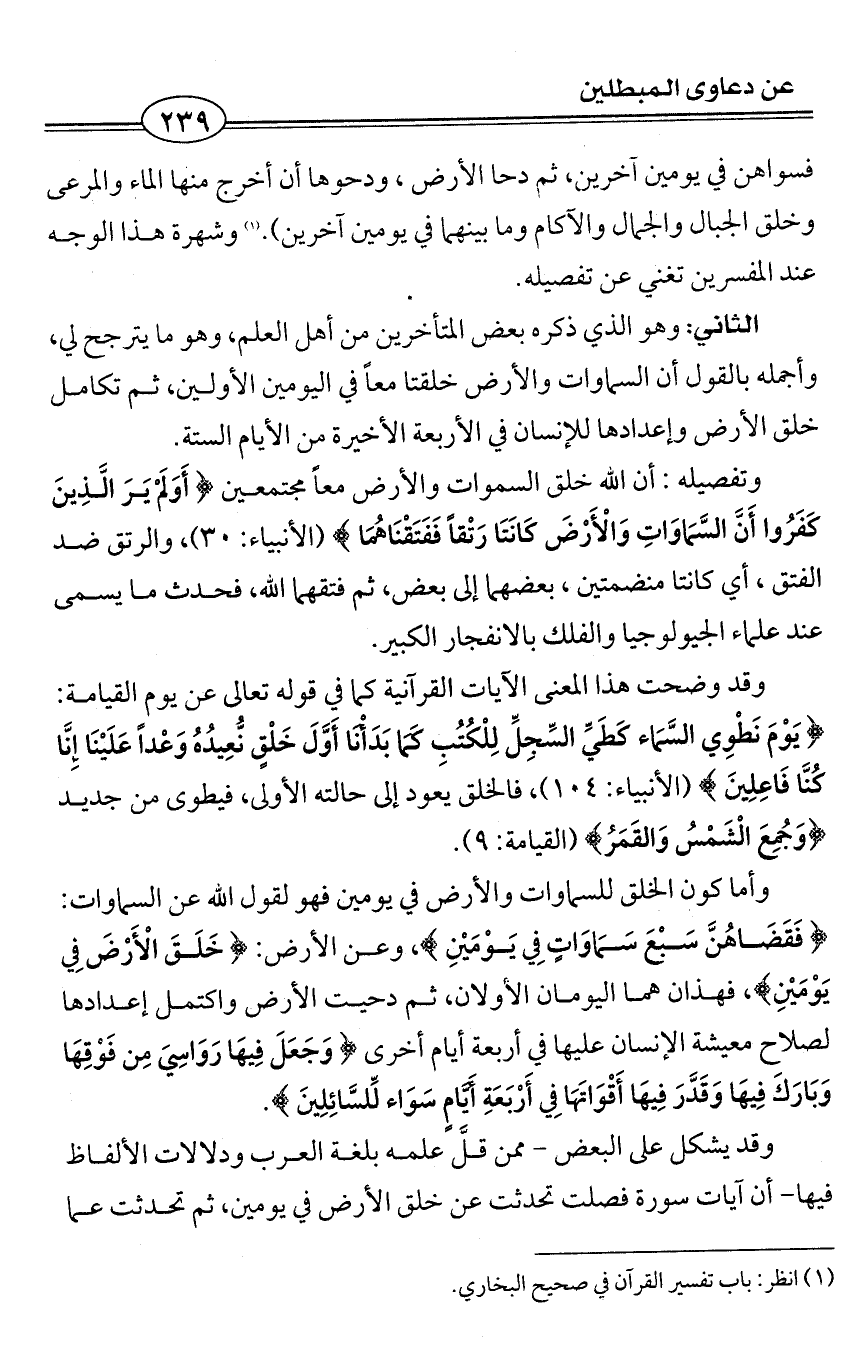 الثاني: وهو الذي ذكره بعض المتأخرين من أهل العلم، وهو ما يترجح لي، وأجمله بالقول: السماوات والأرض خلقتا معاً في اليومين الأولين، ثم تكامل خلق الأرض وإعدادها للإنسان في الأربعة الأخيرة من الأيام الستة.