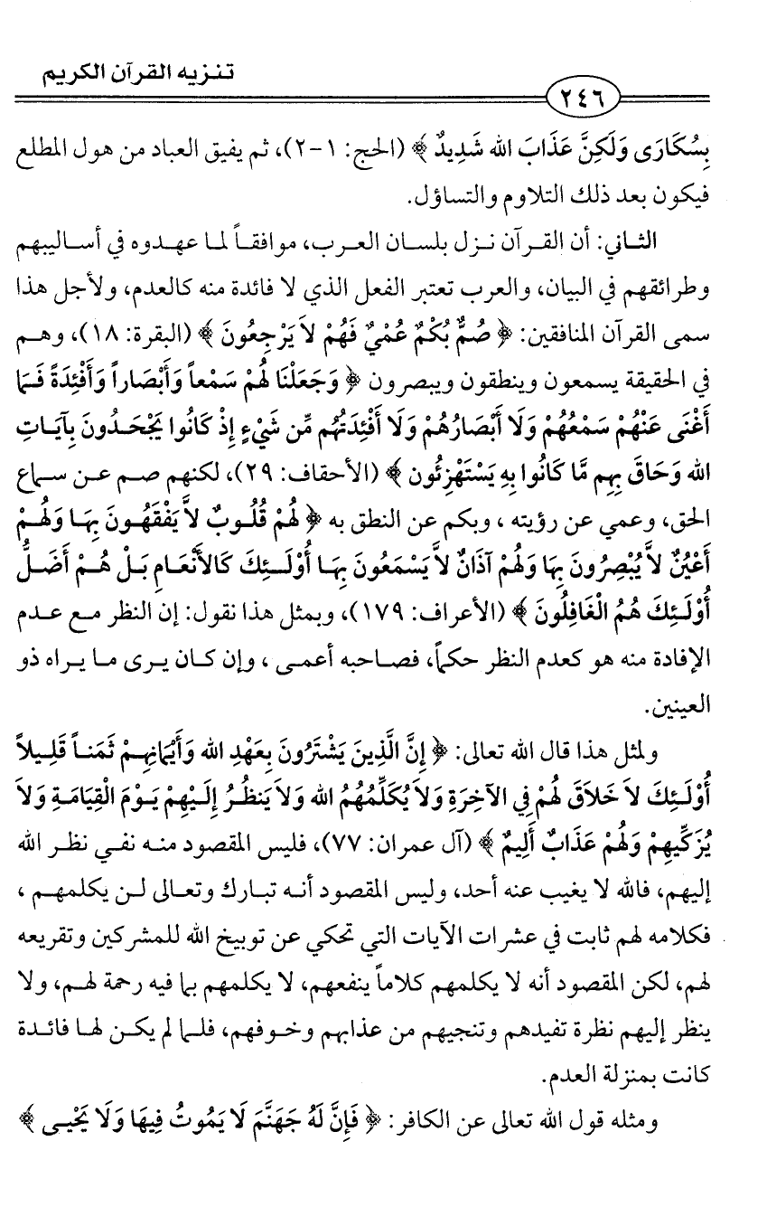 ولمثل هذا قال الله تعالى: {إِنَّ الَّذِينَ يَشْتَرُونَ بِعَهْدِ الله وَأَيْمَانِهِمْ ثَمَناً قَلِيلاً أُوْلَئِكَ لاَ خَلاَقَ لَهُمْ فِي الآخِرَةِ وَلاَ يُكَلِّمُهُمُ الله وَلاَ يَنظُرُ إِلَيْهِمْ يَوْمَ الْقِيَامَةِ وَلاَ يُزَكِّيهِمْ وَلَهُمْ عَذَابٌ أَلِيمٌ} (آل عمران: 77)، فليس المقصود منه نفي نظر الله إليهم، فالله لا يغيب عنه أحد، وليس المقصود أنه تبارك وتعالى لن يكلمهم، فكلامه لهم ثابت في عشرات الآيات التي تحكي عن توبيخ الله للمشركين وتقريعه لهم، لكن المقصود أنه لا يكلمهم كلاماً ينفعهم، لا يكلمهم بما فيه رحمة لهم، ولا ينظر إليهم نظرة تفيدهم وتنجيهم من عذابهم وخوفهم، فلما لم يكن لها فائدة كانت بمنزلة العدم.