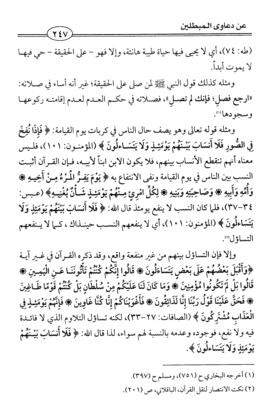 ومثله قوله تعالى وهو يصف حال الناس في كربات يوم القيامة: {فَإِذَا نُفِخَ فِي الصُّورِ فَلَا أَنسَابَ بَيْنَهُمْ يَوْمَئِذٍ وَلَا يَتَسَاءلُونَ} (المؤمنون: 101)، فليس معناه أنهم تنقطع الأنساب بينهم، فلا يكون الابن ابناً لأبيه، فإن القرآن أثبت النسب بين الناس في يوم القيامة ونفى الانتفاع به {يَوْمَ يَفِرُّ الْمَرْءُ مِنْ أَخِيهِ وَأُمِّهِ وَأَبِيهِ وَصَاحِبَتِهِ وَبَنِيهِ لِكُلِّ امْرِئٍ مِنْهُمْ يَوْمَئِذٍ شَأْنٌ يُغْنِيهِ} (عبس: 34 - 37)، فلما كان النسب لا ينفع يومئذ قال الله: {فَلَا أَنسَابَ بَيْنَهُمْ يَوْمَئِذٍ وَلَا يَتَسَاءلُونَ} (المؤمنون: 101)، أي لا ينفعهم النسب حينذاك، كما لا ينفعهم التساؤل (¬2).