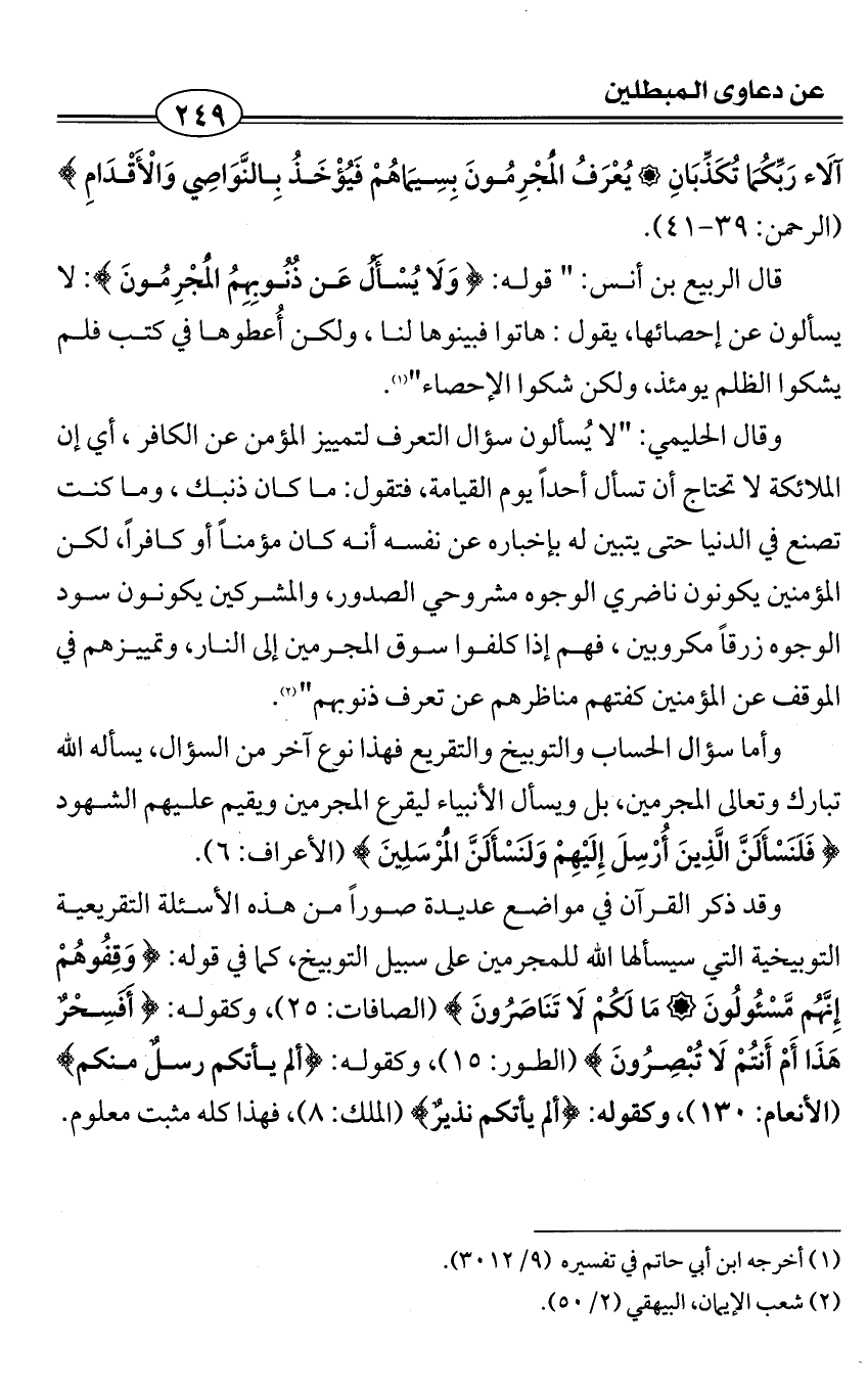 آلَاء رَبِّكُمَا تُكَذِّبَانِ يُعْرَفُ الْمُجْرِمُونَ بِسِيمَاهُمْ فَيُؤْخَذُ بِالنَّوَاصِي وَالْأَقْدَامِ} (الرحمن: 39 - 41).