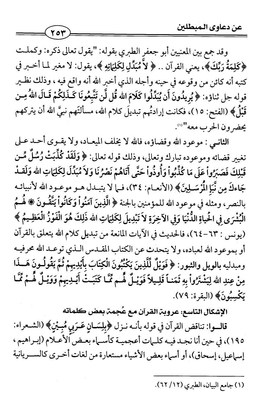 الثاني: موعود الله وقضاؤه، فالله لا يخلف الميعاد، ولا يقوى أحد على تغيير قضائه وموعوده تبارك وتعالى، وذلك قوله تعالى: {وَلَقَدْ كُذِّبَتْ رُسُلٌ مِّن قَبْلِكَ فَصَبَرُوا عَلَى مَا كُذِّبُوا وَأُوذُوا حَتَّى أَتَاهُمْ نَصْرُنَا وَلاَ مُبَدِّلَ لِكَلِمَاتِ الله وَلَقدْ جَاءكَ مِن نَّبَإِ الْمُرْسَلِينَ} (الأنعام: 34)، فما لا يتبدل هو موعود الله لأنبيائه بالنصر، ومثله في موعود الله للمؤمنين بالجنة {الَّذِينَ آمَنُوا وَكَانُوا يَتَّقُونَ لَهُمُ الْبُشْرَى فِي الْحَياةِ الدُّنْيَا وَفِي الآخِرَةِ لاَ تَبْدِيلَ لِكَلِمَاتِ الله ذَلِكَ هُوَ الْفَوْزُ الْعَظِيمُ} (يونس: 63 - 64)، فالحديث في الآيات المانعة من تبديل كلام الله يتعلق بالقرآن أو بموعود الله لعباده، ولا يتحدث عن الكتاب المقدس الذي توعد الله محرفيه ومبدليه بالويل والثبور: {فَوَيْلٌ لِّلَّذِينَ يَكْتُبُونَ الْكِتَابَ بِأَيْدِيهِمْ ثُمَّ يَقُولُونَ هَذَا مِنْ عِندِ الله لِيَشْتَرُوا بِهِ ثَمَناً قَلِيلاً فَوَيْلٌ لَّهُم مِّمَّا كَتَبَتْ أَيْدِيهِمْ وَوَيْلٌ لَّهُمْ مِّمَّا يَكْسِبُونَ} (البقرة: 79).