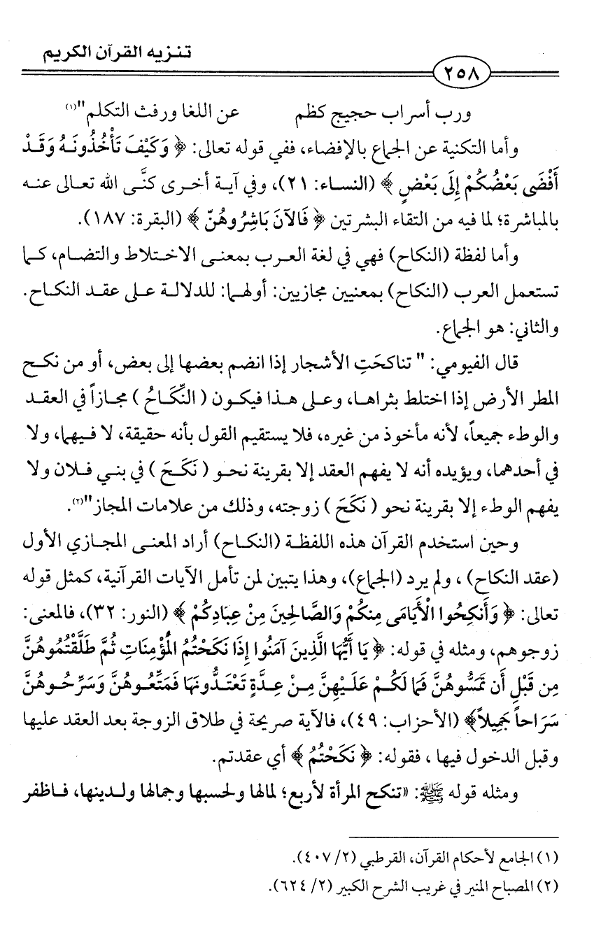 وحين استخدم القرآن هذه اللفظة (النكاح) أراد المعنى المجازي الأول (عقد النكاح)، ولم يرد (الجماع)، وهذا يتبين لمن تأمل الآيات القرآنية، كمثل قوله تعالى: {وَأَنكِحُوا الْأَيَامَى مِنكُمْ وَالصَّالِحِينَ مِنْ عِبَادِكُمْ} (النور: 32)، فالمعنى: زوجوهم، ومثله في قوله: {يَا أَيُّهَا الَّذِينَ آمَنُوا إِذَا نَكَحْتُمُ الْمُؤْمِنَاتِ ثُمَّ طَلَّقْتُمُوهُنَّ مِن قَبْلِ أَن تَمَسُّوهُنَّ فَمَا لَكُمْ عَلَيْهِنَّ مِنْ عِدَّةٍ تَعْتَدُّونَهَا فَمَتِّعُوهُنَّ وَسَرِّحُوهُنَّ سَرَاحاً جَمِيلاً} (الأحزاب: 49)، فالآية صريحة في طلاق الزوجة بعد العقد عليها وقبل الدخول فيها، فقوله: {نَكَحْتُمُ} أي عقدتم.
