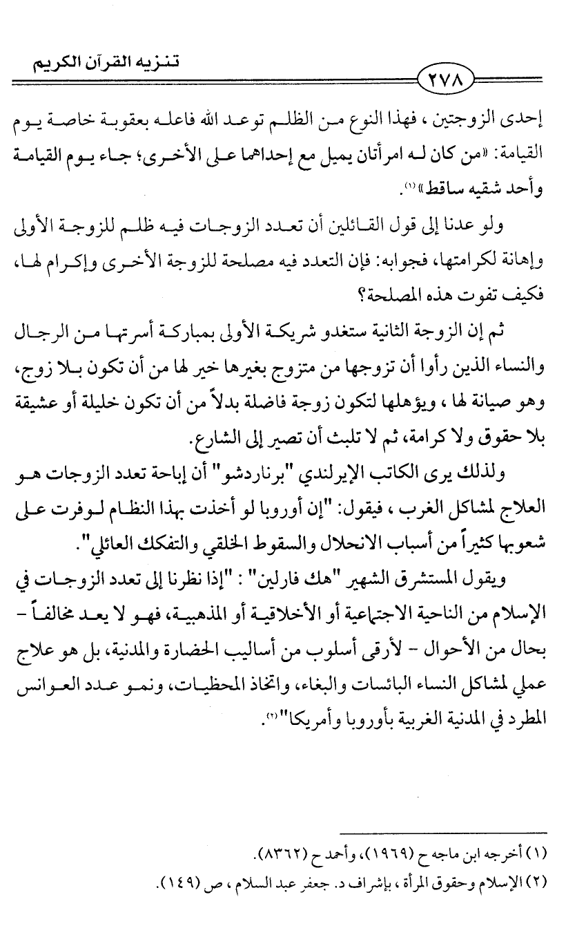 ويقول المستشرق الشهير "هك فارلين": "إذا نظرنا إلى تعدد الزوجات في الإسلام من الناحية الاجتماعية أو الأخلاقية أو المذهبية، فهو لا يعد مخالفاً -بحال من الأحوال - لأرقى أسلوب من أساليب الحضارة والمدنية، بل هو علاج عملي لمشاكل النساء البائسات والبغاء، واتخاذ المحظيات، ونمو عدد العوانس المطرد في المدنية الغربية بأوروبا وأمريكا" (¬2).