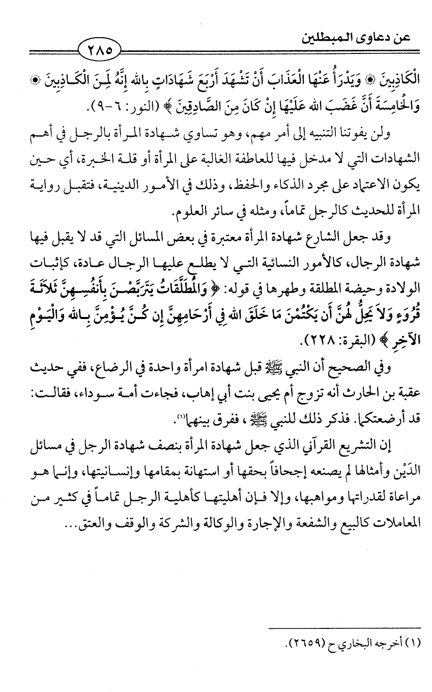 إن التشريع القرآني الذي جعل شهادة المرأة بنصف شهادة الرجل في مسائل الدَيْن وأمثالها لم يصنعه إجحافاً بحقها أو استهانة بمقامها وإنسانيتها، وإنما هو مراعاة لقدراتها ومواهبها، وإلا فإن أهليتها كأهلية الرجل تماماً في كثير من المعاملات كالبيع والشفعة والإجارة والوكالة والشركة والوقف والعتق ...