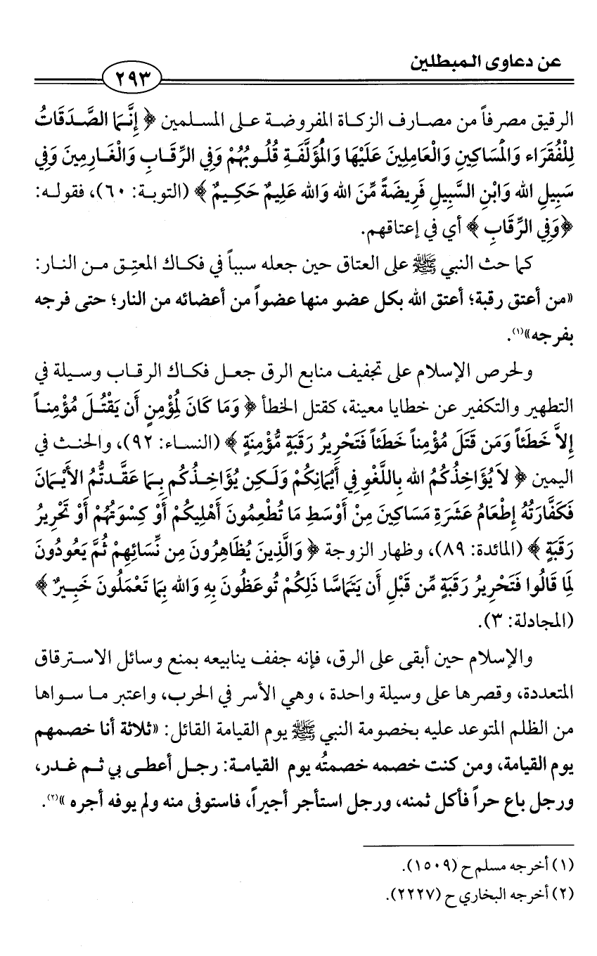 الرقيق مصرفاً من مصارف الزكاة المفروضة على المسلمين {إِنَّمَا الصَّدَقَاتُ لِلْفُقَرَاء وَالْمَسَاكِينِ وَالْعَامِلِينَ عَلَيْهَا وَالْمُؤَلَّفَةِ قُلُوبُهُمْ وَفِي الرِّقَابِ وَالْغَارِمِينَ وَفِي سَبِيلِ الله وَابْنِ السَّبِيلِ فَرِيضَةً مِّنَ الله وَالله عَلِيمٌ حَكِيمٌ} (التوبة: 60)، فقوله: {وَفِي الرِّقَابِ} أي في إعتاقهم.