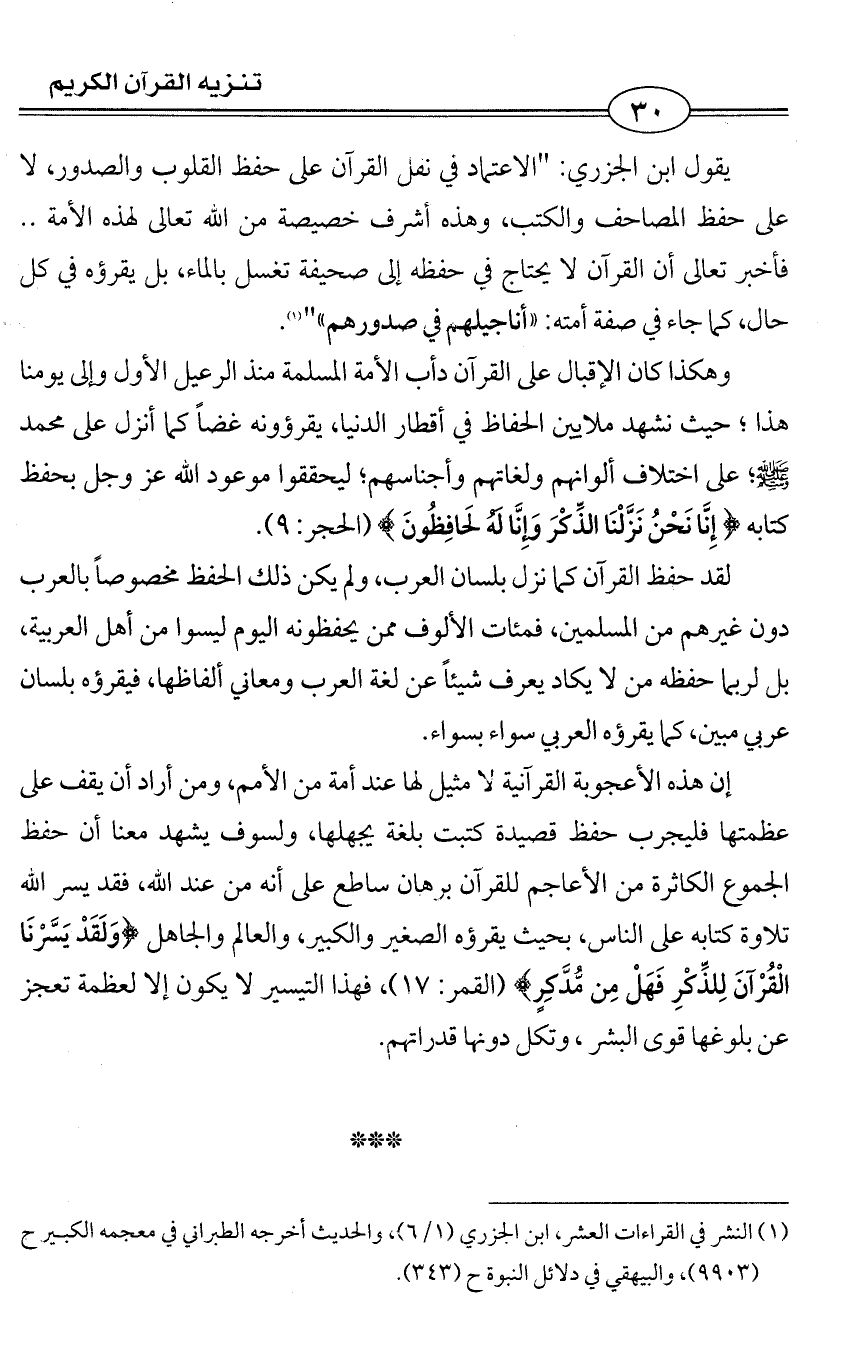 يقول ابن الجزري: "الاعتماد في نقل القرآن على حفظ القلوب والصدور، لا على حفظ المصاحف والكتب، وهذه أشرف خصيصة من الله تعالى لهذه الأمة .. فأخبر تعالى أن القرآن لا يحتاج في حفظه إلى صحيفة تغسل بالماء، بل يقرؤه في كل حال، كما جاء في صفة أمته: «أناجيلهم في صدورهم» " (¬1).