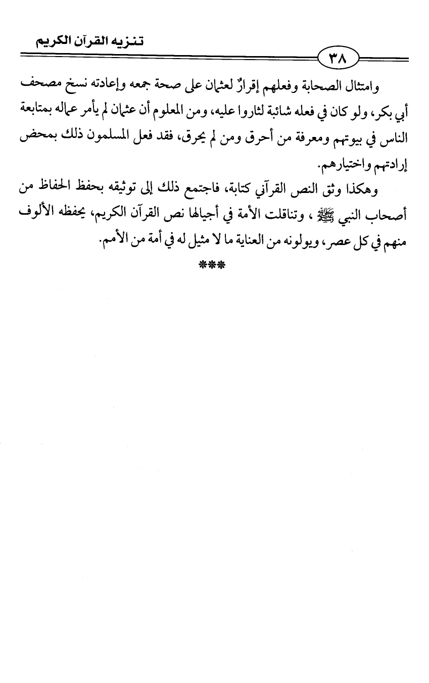 وهكذا وثق النص القرآني كتابة، فاجتمع ذلك إلى توثيقه بحفظ الحفاظ من أصحاب النبي - صلى الله عليه وسلم -، وتناقلت الأمة في أجيالها نص القرآن الكريم، يحفظه الألوف منهم في كل عصر، ويولونه من العناية ما لا مثيل له في أمة من الأمم.