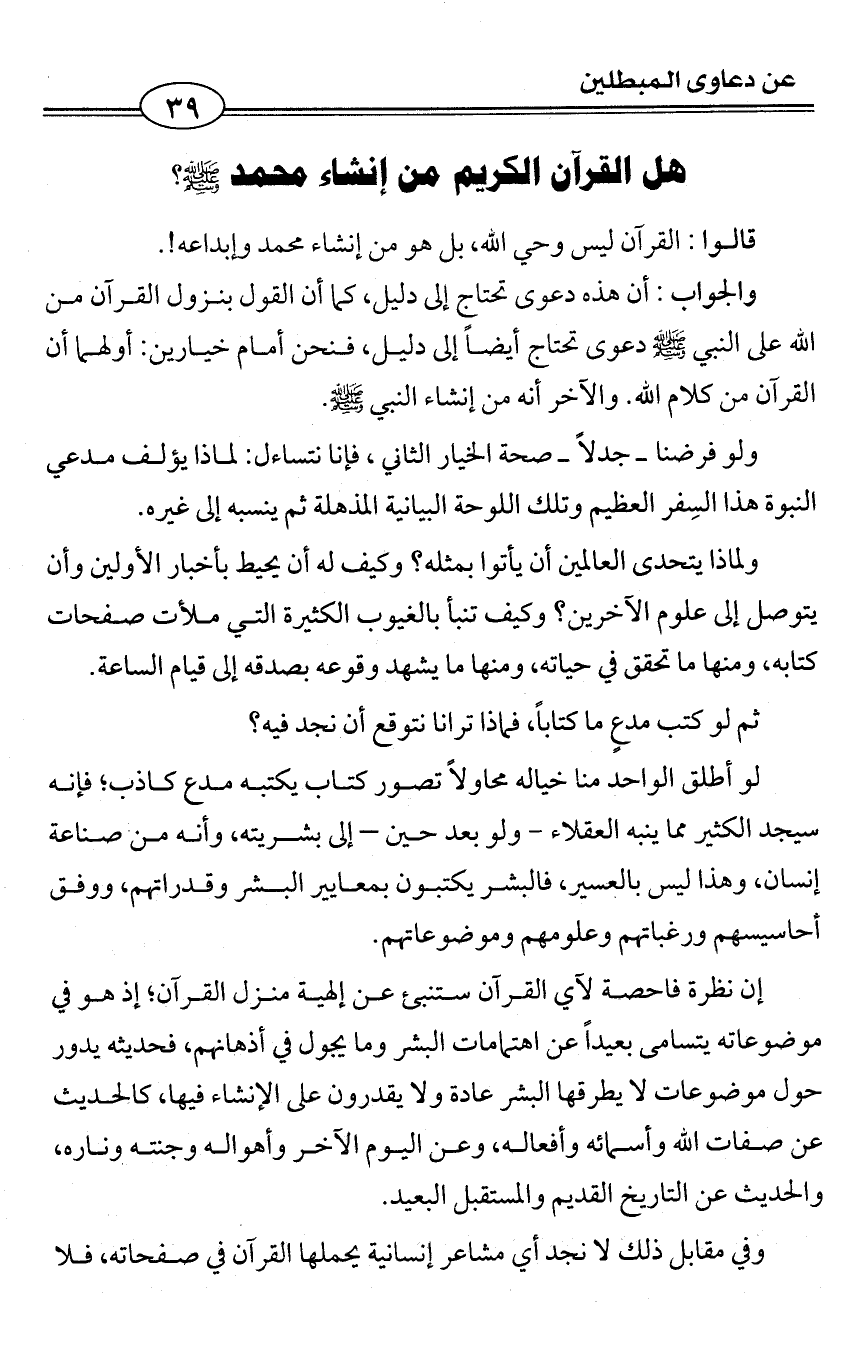 والجواب: أن هذه دعوى تحتاج إلى دليل، كما أن القول بنزول القرآن من الله على النبي - صلى الله عليه وسلم - دعوى تحتاج أيضاً إلى دليل، فنحن أمام خيارين: أولهما أن القرآن من كلام الله. والآخر أنه من إنشاء النبي - صلى الله عليه وسلم -.