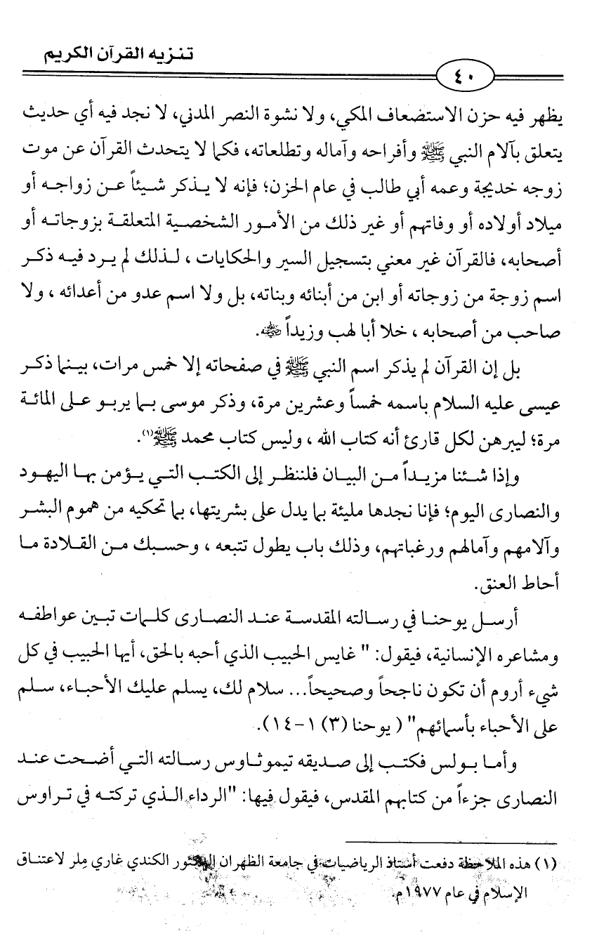 بل إن القرآن لم يذكر اسم النبي - صلى الله عليه وسلم - في صفحاته إلا خمس مرات، بينما ذكر عيسى عليه السلام باسمه خمساً وعشرين مرة، وذكر موسى بما يربو على المائة مرة؛ ليبرهن لكل قارئ أنه كتاب الله، وليس كتاب محمد - صلى الله عليه وسلم - (¬1).
