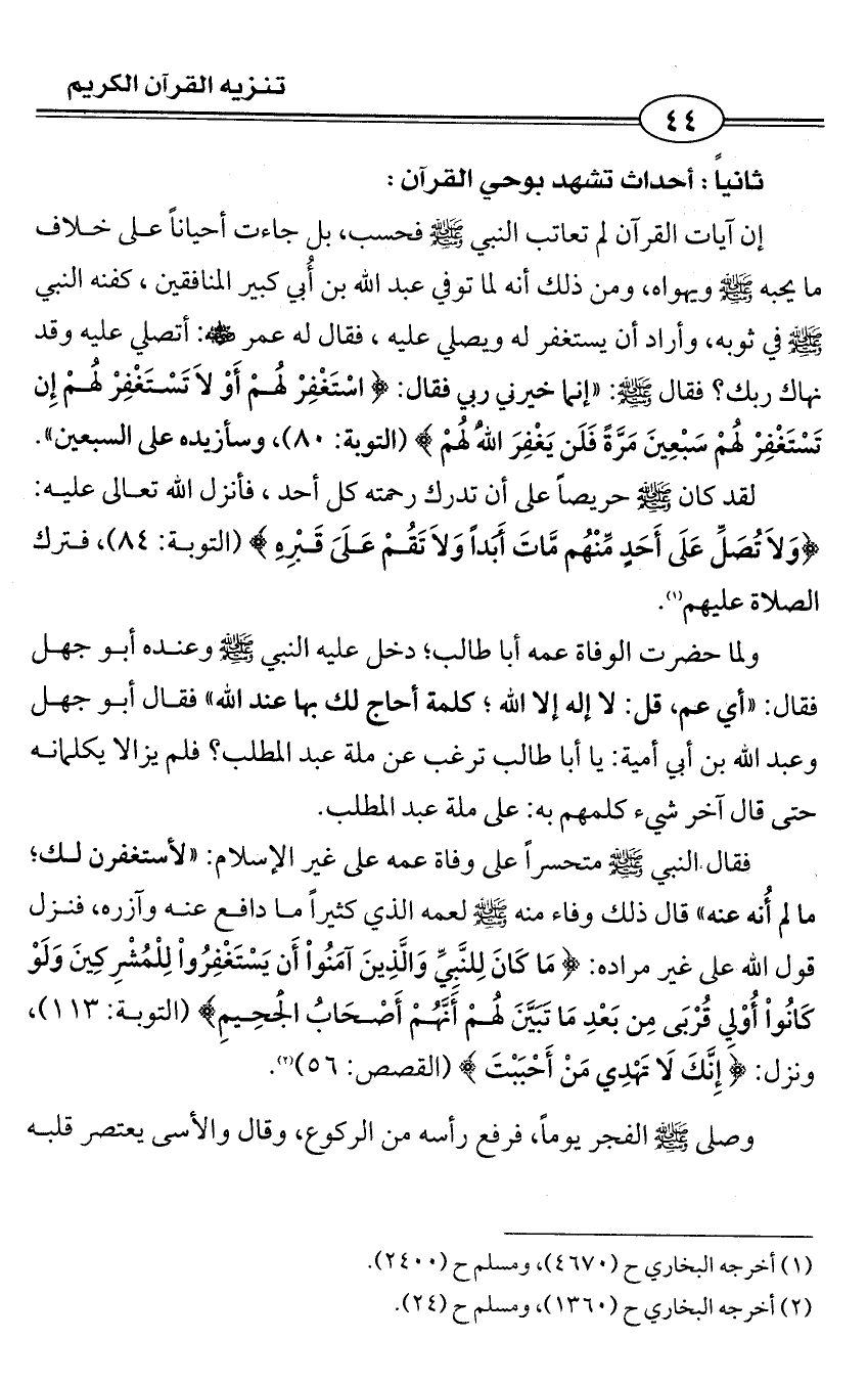 فقال النبي - صلى الله عليه وسلم - متحسراً على وفاة عمه على غير الإسلام: «لأستغفرن لك؛ ما لم أُنه عنه» قال ذلك وفاء منه - صلى الله عليه وسلم - لعمه الذي كثيراً ما دافع عنه وآزره، فنزل قول الله على غير مراده: {مَا كَانَ لِلنَّبِيِّ وَالَّذِينَ آمَنُوا أَن يَسْتَغْفِرُوا لِلْمُشْرِكِينَ وَلَوْ كَانُوا أُوْلِي قُرْبَى مِن بَعْدِ مَا تَبَيَّنَ لَهُمْ أَنَّهُمْ أَصْحَابُ الْجَحِيمِ} (التوبة: 113)، ونزل: {إِنَّكَ لَا تَهْدِي مَنْ أَحْبَبْتَ} (القصص: 56) (¬2).