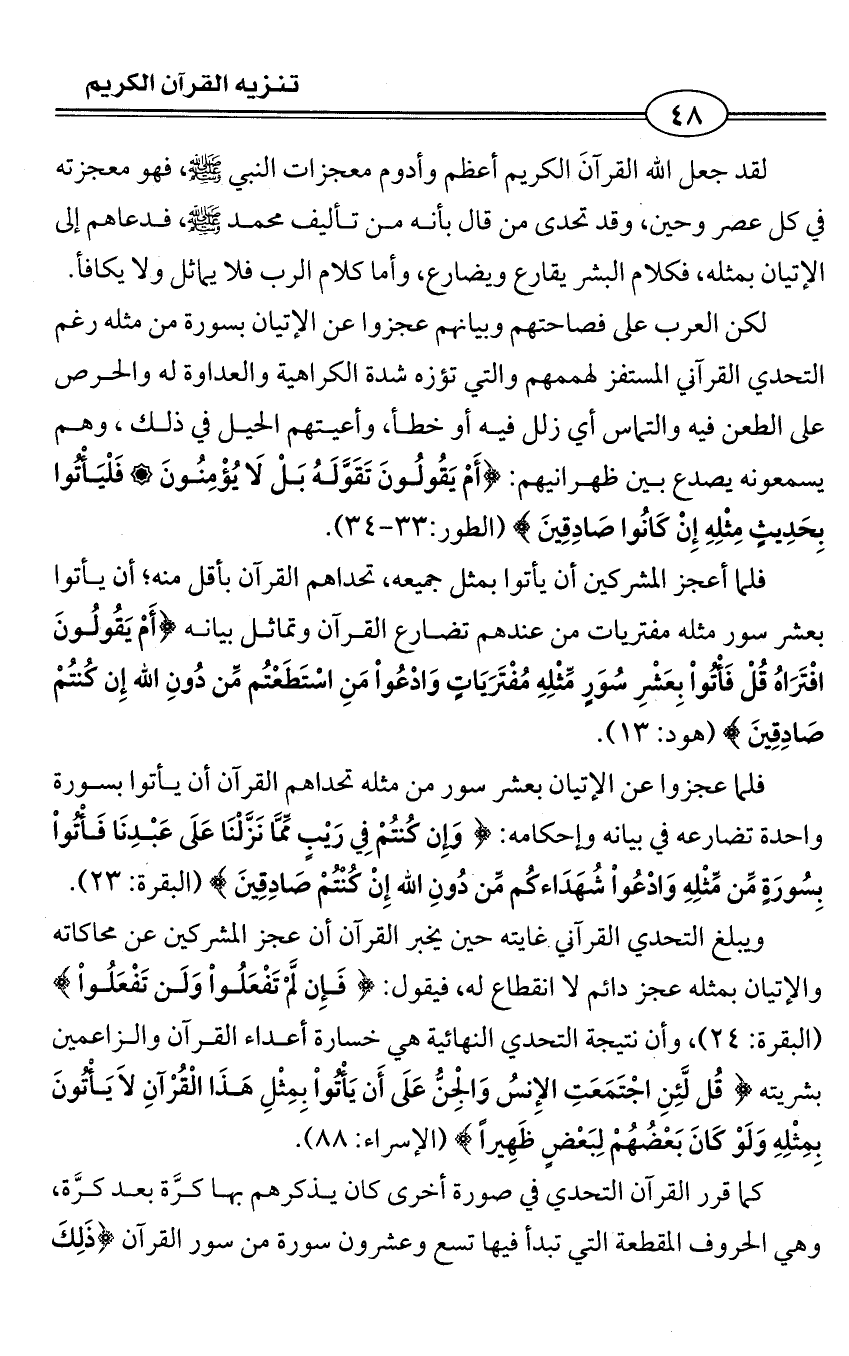 لقد جعل الله القرآنَ الكريم أعظم وأدوم معجزات النبي - صلى الله عليه وسلم -، فهو معجزته في كل عصر وحين، وقد تحدى من قال بأنه من تأليف محمد - صلى الله عليه وسلم -، فدعاهم إلى الإتيان بمثله، فكلام البشر يقارع ويضارع، وأما كلام الرب فلا يماثل ولا يكافأ.