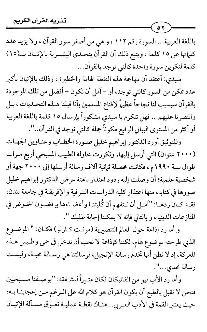سيدي: أعتقد أن مهاجمة هذه النقطة الهامة والخطيرة، وذلك بالإتيان بأكبر عدد ممكن من السور كالتي توجد، أو - آمل أن تكون - أفضل من تلك الموجودة بالقرآن سيسبب لنا نجاحاً عظيماً لإقناع المسلمين بأنا قبلنا هذه التحديات، بل وانتصرنا عليهم ... فهل تتكرم يا سيدي مشكوراً بإرسال 15 كلمة باللغة العربية أو أكثر من المستوى البياني الرفيع مكوناً جملة كالتي توجد في القرآن .. ".