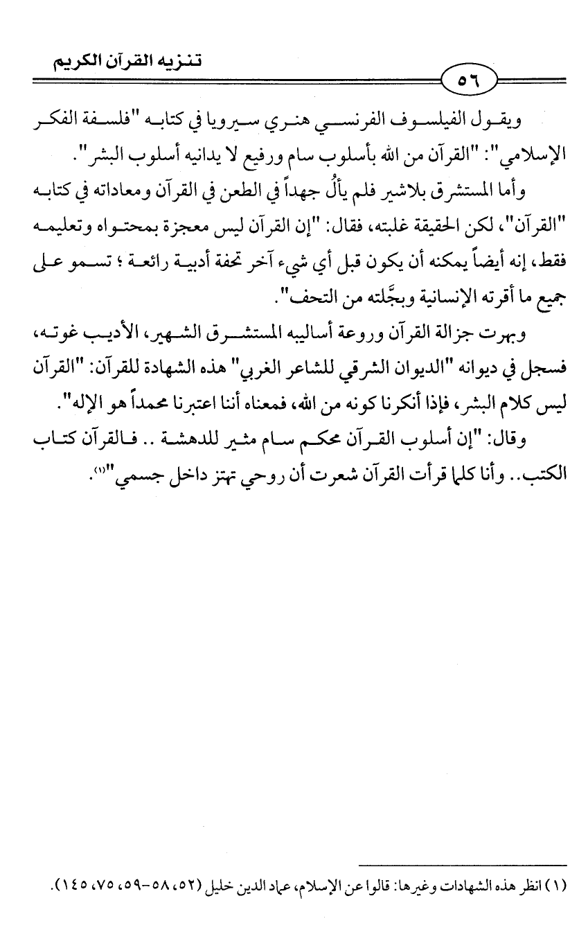ويقول الفيلسوف الفرنسي هنري سيرويا في كتابه "فلسفة الفكر الإسلامي": "القرآن من الله بأسلوب سام ورفيع لا يدانيه أسلوب البشر".