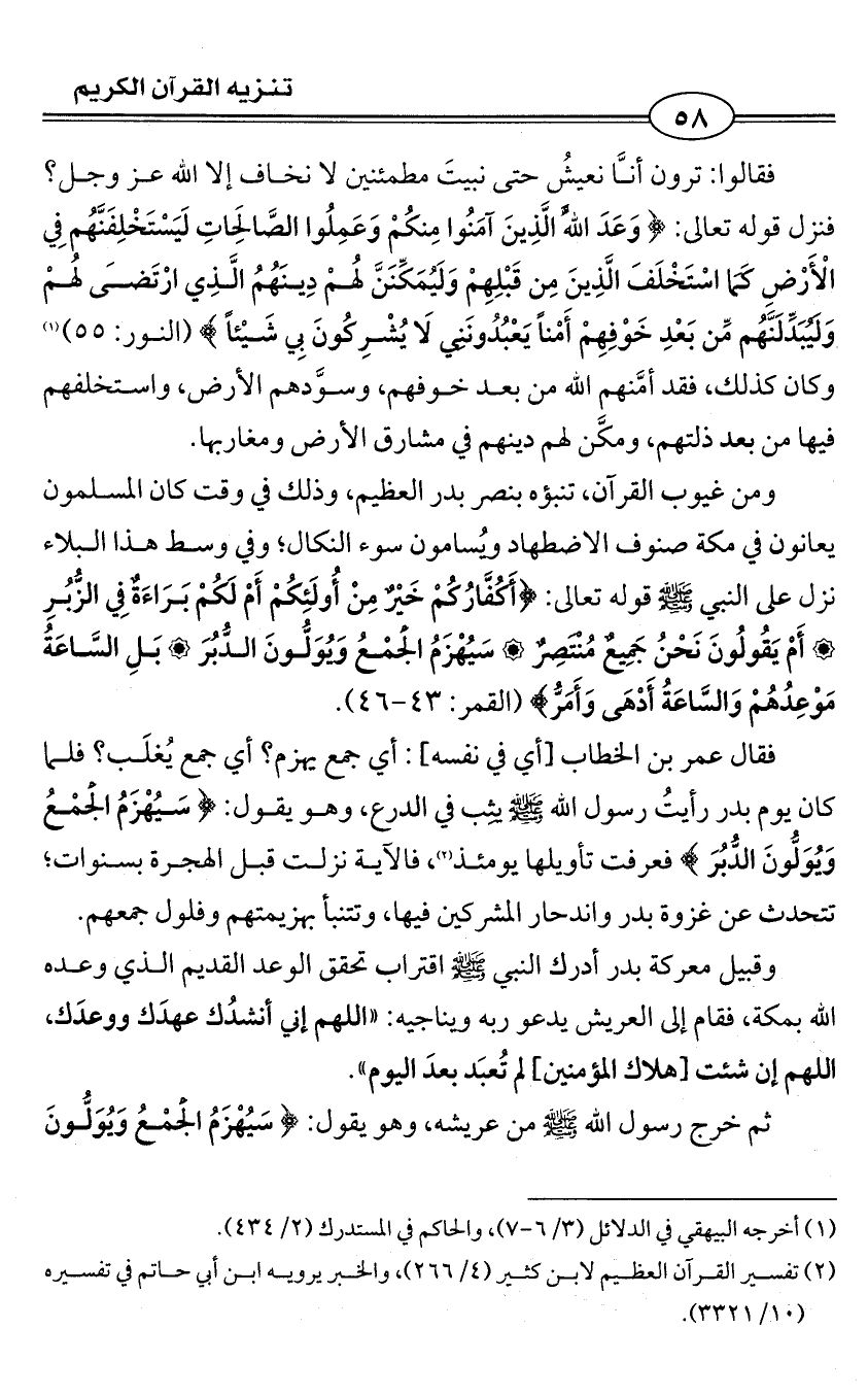 فقال عمر بن الخطاب [أي في نفسه]: أي جمع يهزم؟ أي جمع يُغلَب؟ فلما كان يوم بدر رأيتُ رسول الله - صلى الله عليه وسلم - يثِب في الدرع، وهو يقول: {سَيُهْزَمُ الْجَمْعُ وَيُوَلُّونَ الدُّبُرَ} فعرفت تأويلها يومئذ (¬2)، فالآية نزلت قبل الهجرة بسنوات؛ تتحدث عن غزوة بدر واندحار المشركين فيها، وتتنبأ بهزيمتهم وفلول جمعهم.