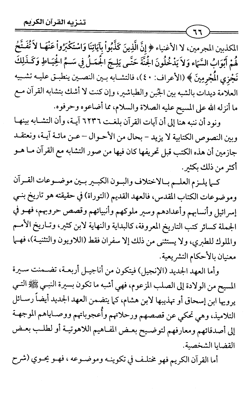 كما يلزم العلم بالاختلاف والبون الكبير بين موضوعات القرآن وموضوعات الكتاب المقدس، فالعهد القديم (التوراة) في حقيقته هو تاريخ بني إسرائيل وأنسابهم وأعدادهم وسير ملوكهم وأنبيائهم وقصص حروبهم، فهو في الجملة كسائر كتب التاريخ المعروفة، كالبداية والنهاية لابن كثير، وتاريخ الأمم والملوك للطبري، ولا يستثنى من ذلك إلا سفران فقط (اللاويون والتثنية)، فهما معنيان بالأحكام التشريعية.