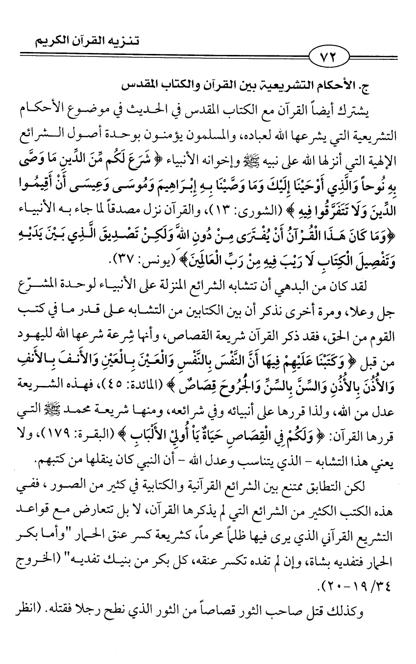 لكن التطابق ممتنع بين الشرائع القرآنية والكتابية في كثير من الصور، ففي هذه الكتب الكثير من الشرائع التي لم يذكرها القرآن، لا بل تتعارض مع قواعد التشريع القرآني الذي يرى فيها ظلماً محرماً، كشريعة كسر عنق الحمار "وأما بكر الحمار فتفديه بشاة، وإن لم تفده تكسر عنقه، كل بكر من بنيك تفديه" (الخروج 34/ 19 - 20).