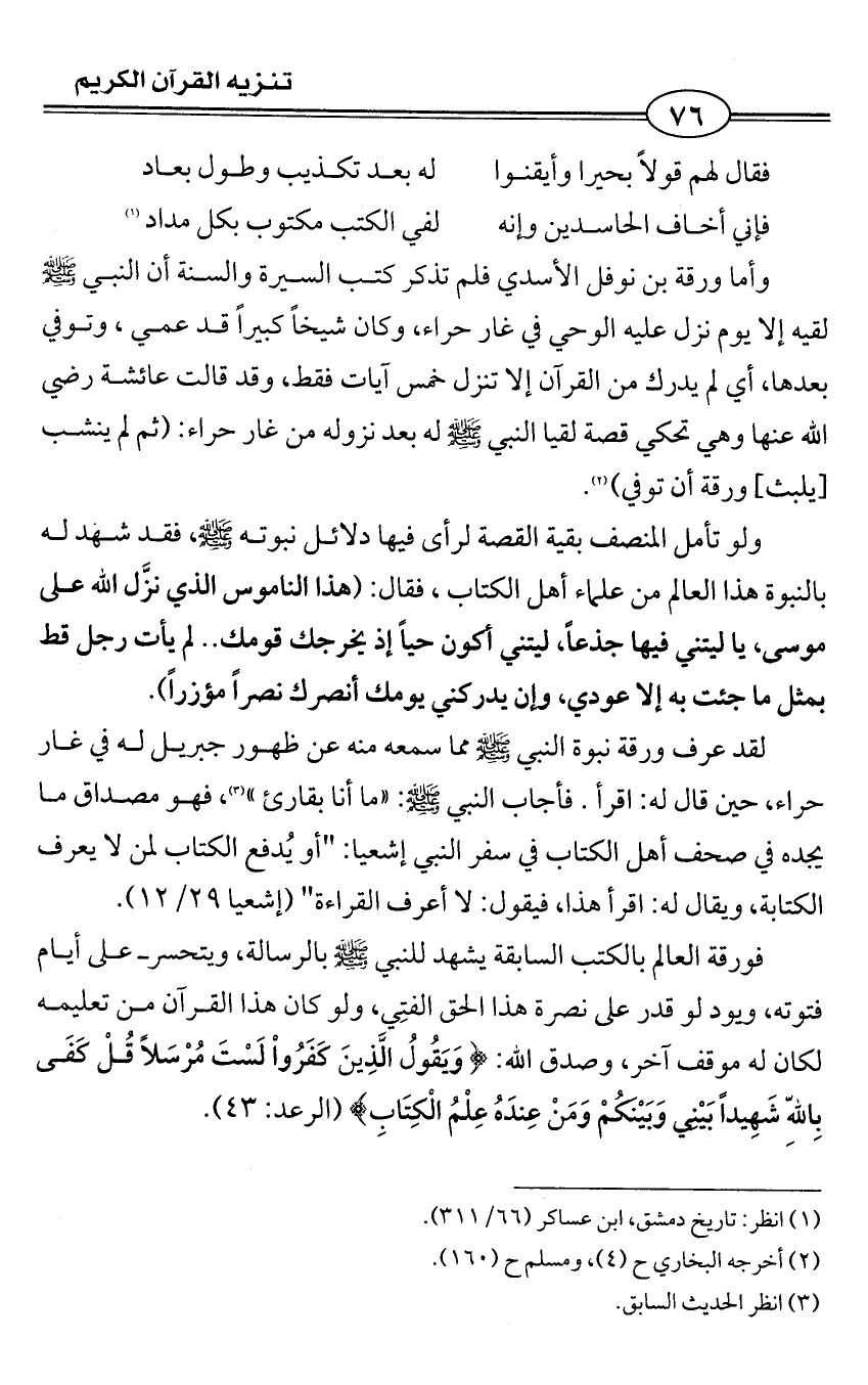 لقد عرف ورقة نبوة النبي - صلى الله عليه وسلم - مما سمعه منه عن ظهور جبريل له في غار حراء، حين قال له: اقرأ. فأجاب النبي - صلى الله عليه وسلم -: «ما أنا بقارئ» (¬3)، فهو مصداق ما يجده في صحف أهل الكتاب في سفر النبي إشعيا: "أو يُدفع الكتاب لمن لا يعرف الكتابة، ويقال له: اقرأ هذا، فيقول: لا أعرف القراءة" (إشعيا 29/ 12).