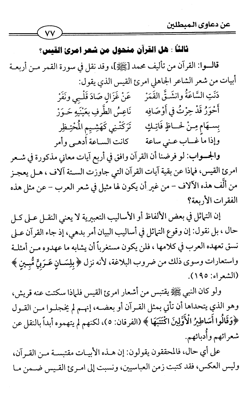 قالوا: القرآن من تأليف محمد [- صلى الله عليه وسلم -]، وقد نقل في سورة القمر من أربعة أبيات من شعر الشاعر الجاهلي امرئ القيس الذي يقول: