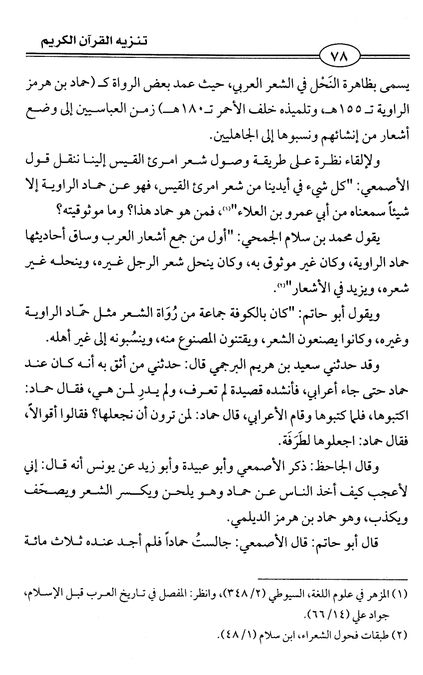 يقول محمد بن سلام الجمحي: "أول من جمع أشعار العرب وساق أحاديثها حماد الراوية، وكان غير موثوق به، وكان ينحل شعر الرجل غيره، وينحله غير شعره، ويزيد في الأشعار" (¬2).