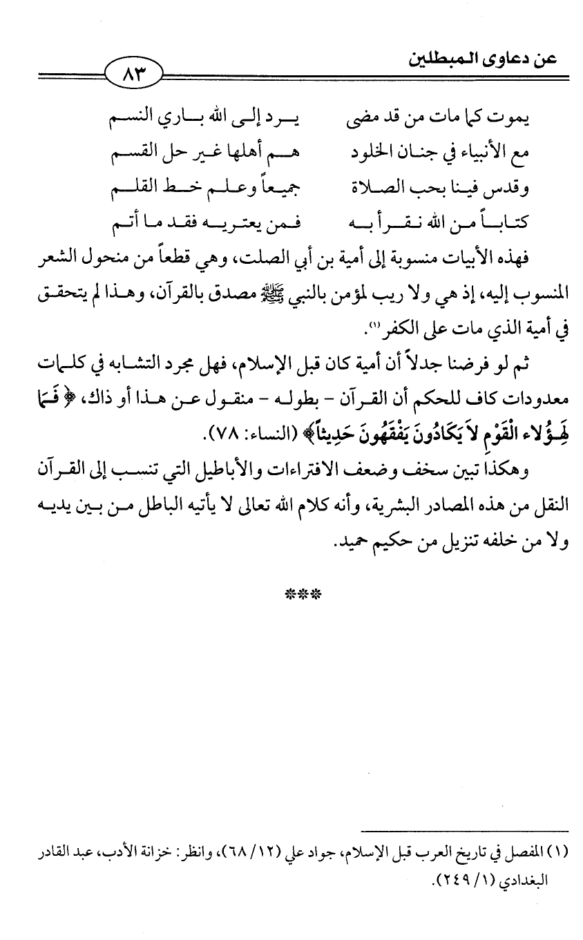 ثم لو فرضنا جدلاً أن أمية كان قبل الإسلام، فهل مجرد التشابه في كلمات معدودات كاف للحكم أن القرآن - بطوله - منقول عن هذا أو ذاك، {فَمَا لِهَؤُلاء الْقَوْمِ لاَ يَكَادُونَ يَفْقَهُونَ حَدِيثاً} (النساء: 78).