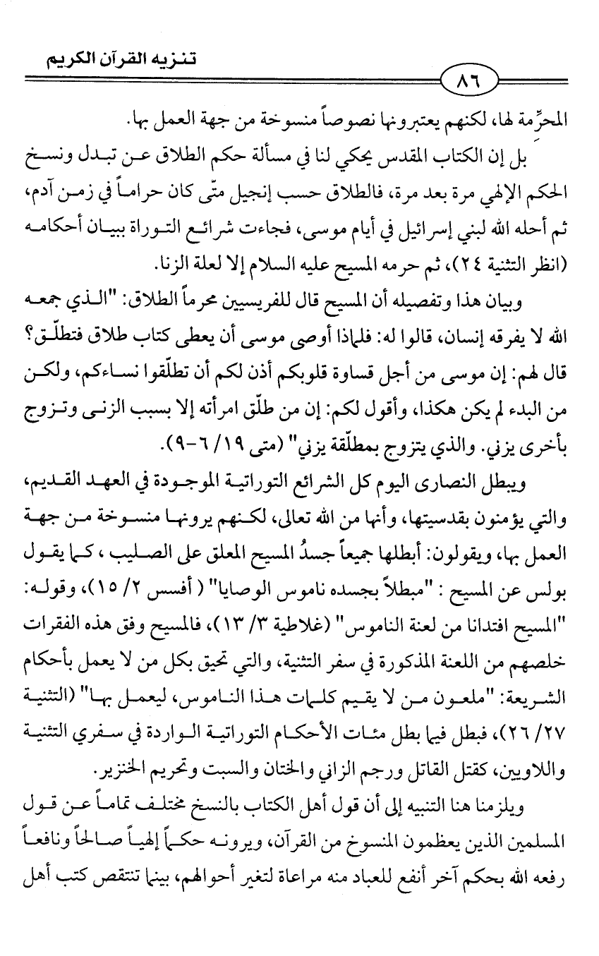 وبيان هذا وتفصيله أن المسيح قال للفريسيين محرماً الطلاق: "الذي جمعه الله لا يفرقه إنسان، قالوا له: فلماذا أوصى موسى أن يعطى كتاب طلاق فتطلّق؟ قال لهم: إن موسى من أجل قساوة قلوبكم أذن لكم أن تطلّقوا نساءكم، ولكن من البدء لم يكن هكذا، وأقول لكم: إن من طلّق امرأته إلا بسبب الزنى وتزوج بأخرى يزني. والذي يتزوج بمطلّقة يزني" (متى 19/ 6 - 9).