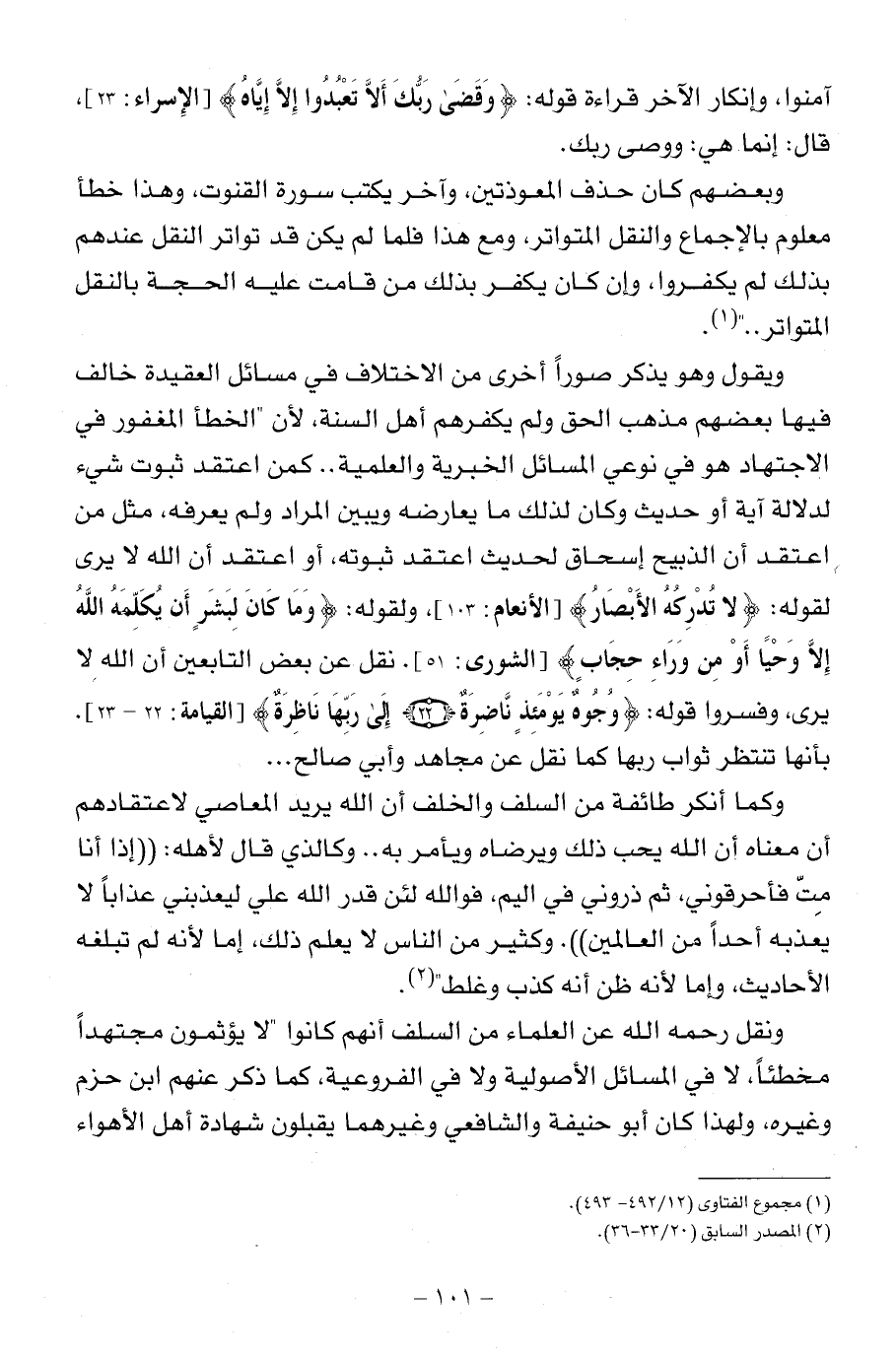 ويقول وهو يذكر صوراً أخرى من الاختلاف في مسائل العقيدة خالف فيها بعضهم مذهب الحق ولم يكفرهم أهل السنة، لأن "الخطأ المغفور في الاجتهاد هو في نوعي المسائل الخبرية والعلمية .. كمن اعتقد ثبوت شيء لدلالة آية أو حديث وكان لذلك ما يعارضه ويبين المراد ولم يعرفه، مثل من اعتقد أن الذبيح إسحاق لحديث اعتقد ثبوته، أو اعتقد أن الله لا يرى لقوله: {لا تدركه الأبصار} (الأنعام: 103)، ولقوله: {وما كان لبشرٍ أن يكلّمه الله إلاّ وحياً أو من وراء حجابٍ} (الشورى: 51). نقل عن بعض التابعين أن الله لا يرى، وفسروا قوله {وجوه يومئذٍ نّاضرة - إلى ربّها ناظرة} (القيامة: 22 - 23). بأنها تنتظر ثواب ربها كما نقل عن مجاهد وأبي صالح ...
