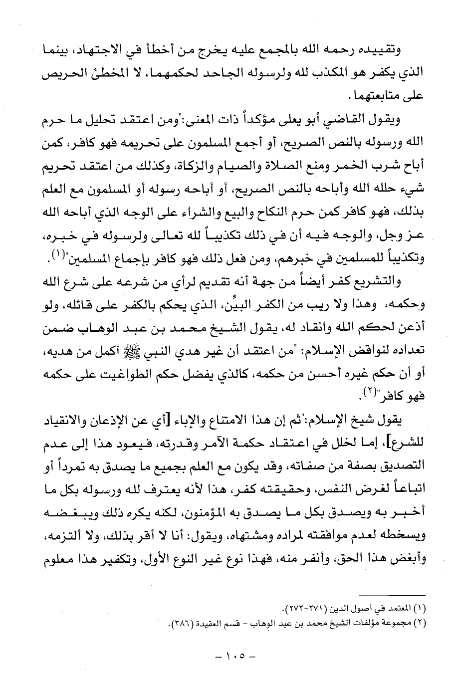 وتقييده رحمه الله بالمجمع عليه يخرج من أخطأ في الاجتهاد، بينما الذي يكفر هو المكذب لله ولرسوله الجاحد لحكمهما، لا المخطئ الحريص على متابعتهما.