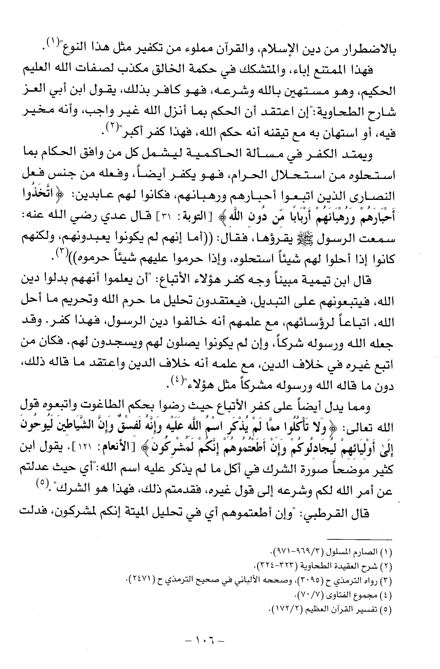 قال ابن تيمية مبيناً وجه كفر هؤلاء الأتباع: " أن يعلموا أنههم بدلوا دين الله، فيتبعونهم على التبديل، فيعتقدون تحليل ما حرم الله وتحريم ما أحل الله، اتباعاً لرؤسائهم، مع علمهم أنه خالفوا دين الرسول، فهذا كفر. وقد جعله الله ورسوله شركاً، وإن لم يكونوا يصلون لهم ويسجدون لهم. فكان من اتبع غيره في خلاف الدين، مع علمه أنه خلاف الدين واعتقد ما قاله ذلك، دون ما قاله الله ورسوله مشركاً مثل هؤلاء". (¬4)