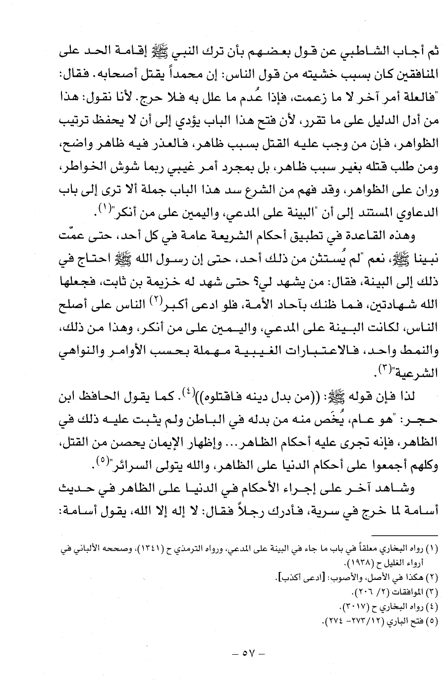 ثم أجاب الشاطبي عن قول بعضهم بأن ترك النبي - صلى الله عليه وسلم - إقامة الحد على المنافقين كان بسبب خشيته من قول الناس: إن محمداً يقتل أصحابه. فقال: " فالعلة أمر آخر لا ما زعمت، فإذا عُدم ما علل به فلا حرج. لأنا نقول: هذا من أدل الدليل على ما تقرر، لأن فتح هذا الباب يؤدي إلى أن لا يحفظ ترتيب الظواهر، فإن من وجب عليه القتل بسبب ظاهر، فالعذر فيه ظاهر واضح، ومن طلب قتله بغير سبب ظاهر، بل بمجرد أمر غيبي ربما شوش الخواطر، وران على الظواهر، وقد فهم من الشرع سد هذا الباب جملة ألا ترى إلى باب الدعاوي المستند إلى أن "البينة على المدعي، واليمين على من أنكر". (¬1)