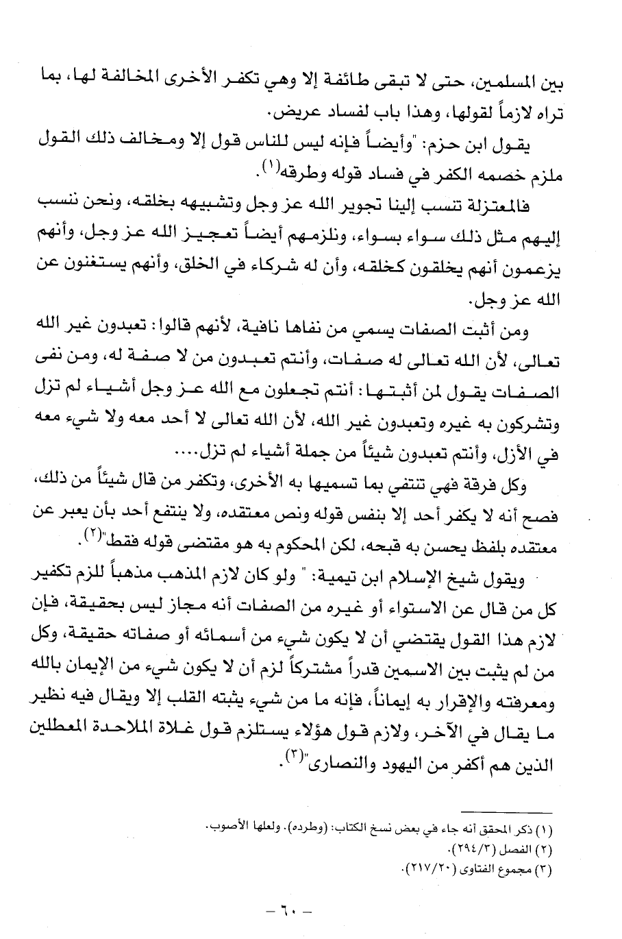 بين المسلمين، حتى لا تبقى طائفة إلا وهي تكفر الأخرى المخالفة لها، بما تراه لازماً لقولها، وهذا باب لفساد عريض.