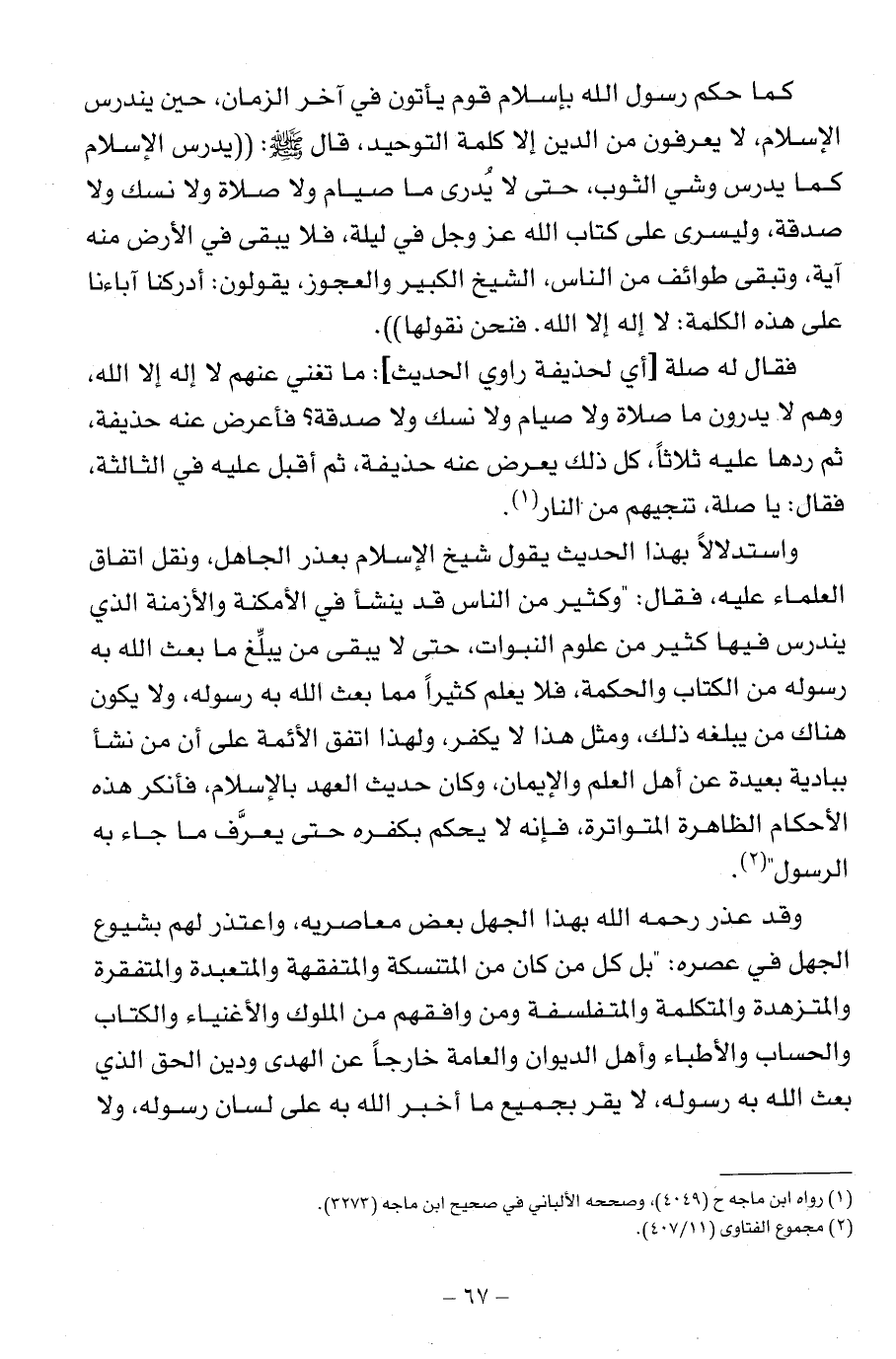 واستدلالاً بهذا الحديث يقول شيخ الإسلام بعذر الجاهل، ونقل اتفاق العلماء عليه، فقال: "وكثير من الناس قد ينشأ في الأمكنة والأزمنة الذي يندرس فيها كثير من علوم النبوات، حتى لا يبقى من يبلِّغ ما بعث الله به رسوله من الكتاب والحكمة، فلا يعلم كثيراً مما بعث الله به رسوله، ولا يكون هناك من يبلغه ذلك، ومثل هذا لا يكفر، ولهذا اتفق الأئمة على أن من نشأ ببادية بعيدة عن أهل العلم والإيمان، وكان حديث العهد بالإسلام، فأنكر هذه الأحكام الظاهرة المتواترة، فإنه لا يحكم بكفره حتى يعرَّف ما جاء به الرسول ". (¬2)