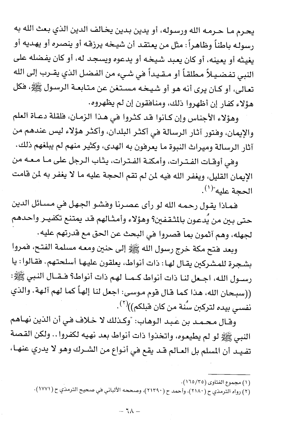 وقال محمد بن عبد الوهاب: " وكذلك لا خلاف في أن الذين نهاهم النبي - صلى الله عليه وسلم - لو لم يطيعوه، واتخذوا ذات أنواط بعد نهيه لكفروا .. ولكن القصة تفيد أن المسلم بل العالم قد يقع في أنواع من الشرك وهو لا يدري عنها،