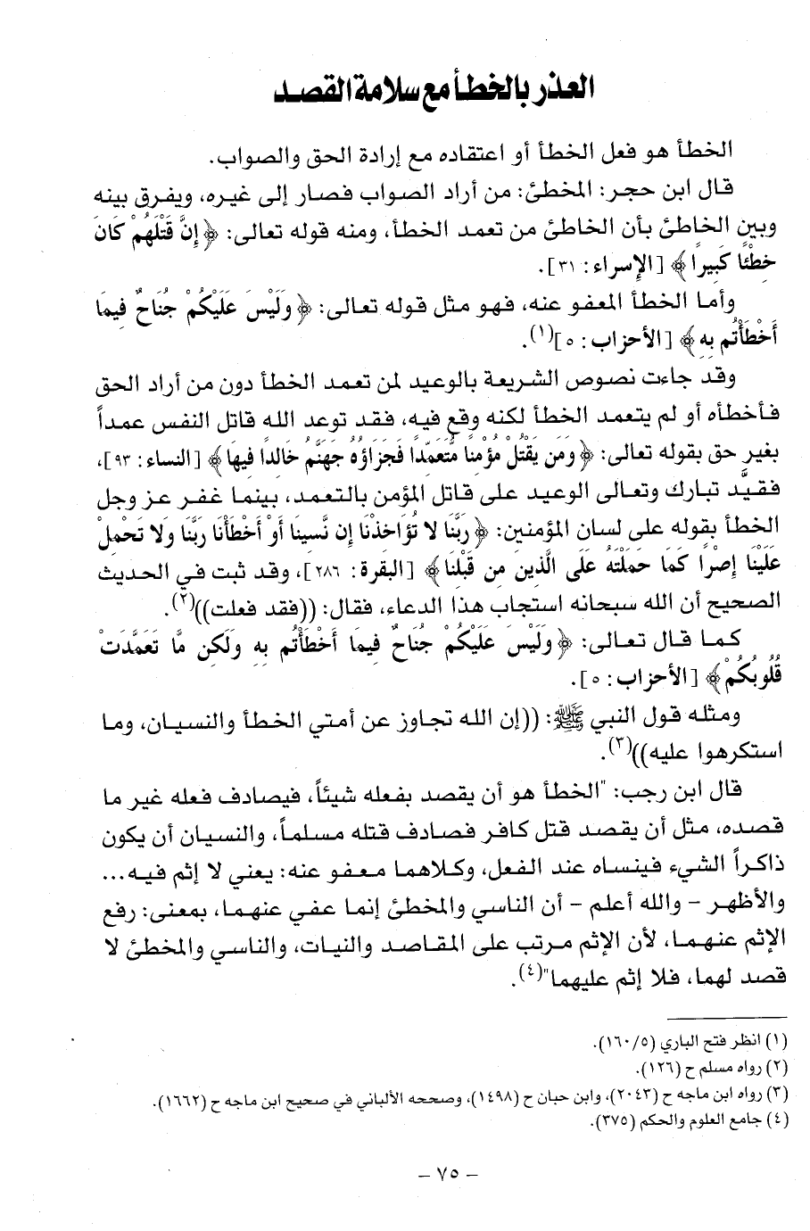 وقد جاءت نصوص الشريعة بالوعيد لمن تعمد الخطأ دون من أراد الحق فأخطأه أو لم يتعمد الخطأ لكنه وقع فيه، فقد توعد الله قاتل النفس عمداً بغير حق بقوله تعالى: {ومن يقتل مؤمناً متعمداً فجزاؤه جهنم خالداً فيها} (النساء:93)، فقيَّد تبارك وتعالى الوعيد على قاتل المؤمن بالتعمد، بينما غفر عز وجل الخطأ بقوله على لسان المؤمنين: {ربنا لا تؤخذنا إن نسينا أو أخطأنا ربنا ولا تحمل علينا إصراً كما حملته على الذين من قبلنا} (البقرة: 286)، وقد ثبت في الحديث الصحيح أن الله سبحانه استجاب هذا الدعاء، فقال: ((فقد فعلت)). (¬2)