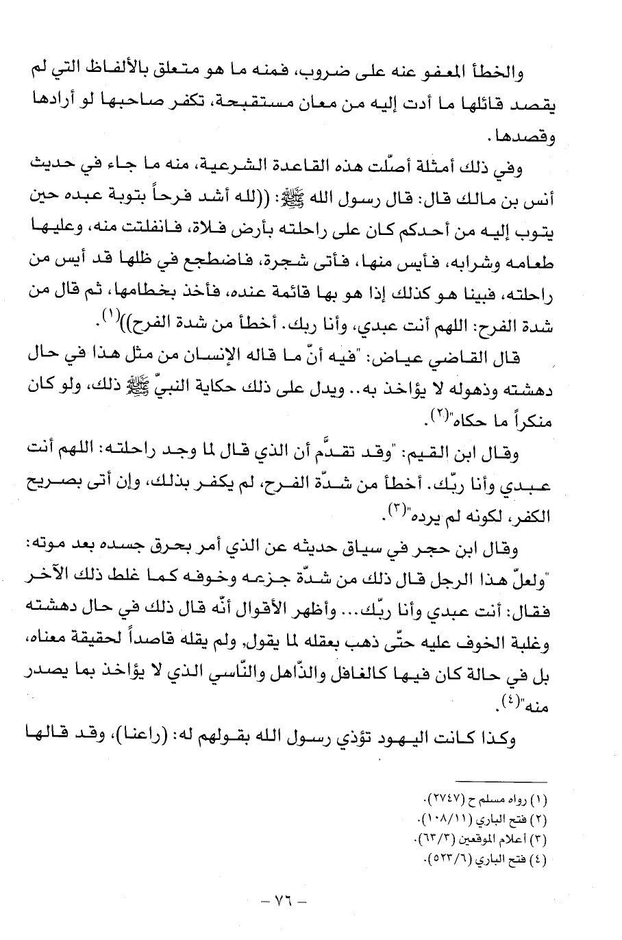 وقال ابن القيم: "وقد تقدَّم أن الذي قال لما وجد راحلته: اللهم أنت عبدي وأنا ربّك. أخطأ من شدّة الفرح، لم يكفر بذلك، وإن أتى بصريح الكفر، لكونه لم يرده". (¬3)