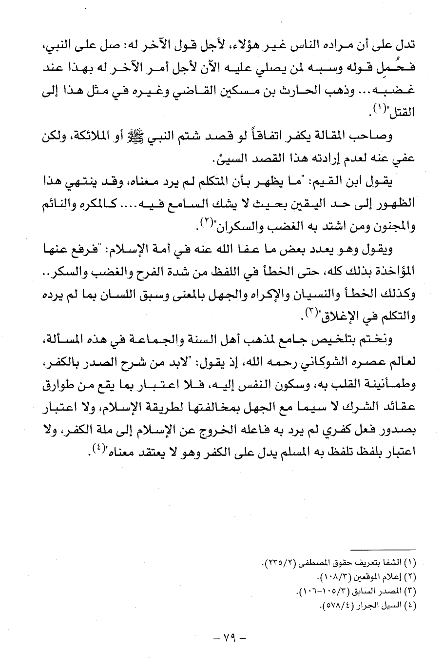 ونختم بتلخيص جامع لمذهب أهل السنة والجماعة في هذه المسألة، لعالم عصره الشوكاني رحمه الله، إذ يقول: " لابد من شرح الصدر بالكفر، وطمأنينة القلب به، وسكون النفس إليه، فلا اعتبار بما يقع من طوارق عقائد الشرك لا سيما مع الجهل بمخالفتها لطريقة الإسلام، ولا اعتبار بصدور فعل كفري لم يرد به فاعله الخروج عن الإسلام إلى ملة الكفر، ولا اعتبار بلفظ تلفظ به المسلم يدل على الكفر وهو لا يعتقد معناه". (¬4)