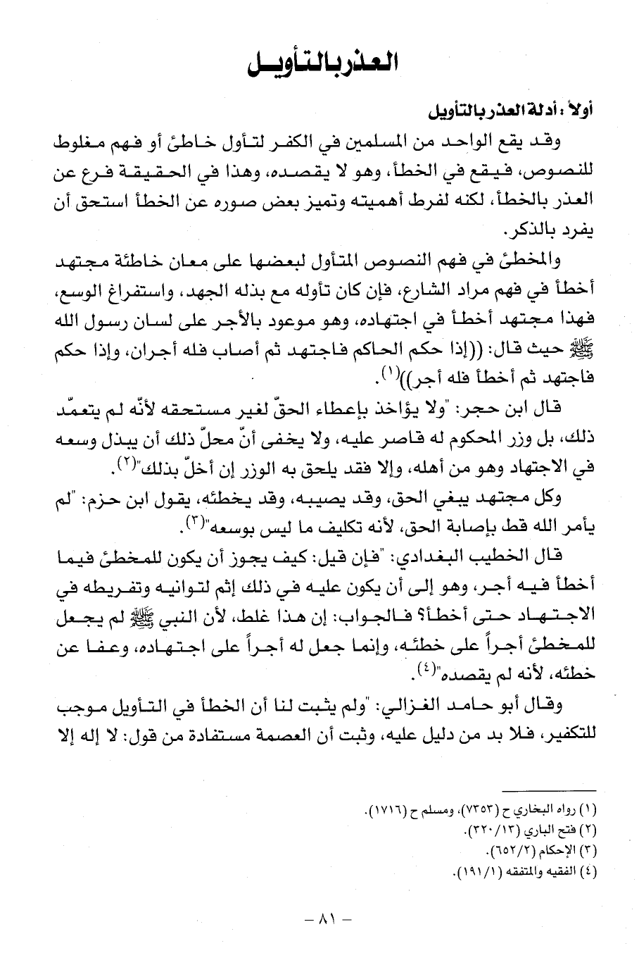 وقال أبو حامد الغزالي: "ولم يثبت لنا أن الخطأ في التأويل موجب للتكفير، فلا بد من دليل عليه، وثبت أن العصمة مستفادة من قول: لا إله إلا