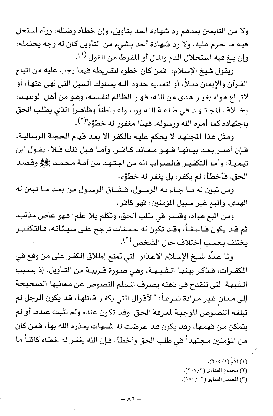 ومن اتبع هواه، وقصر في طلب الحق، وتكلم بلا علم: فهو عاص مذنب، ثم قد يكون فاسقاً، وقد تكون له حسنات ترجح على سيئاته، فالتكفير يختلف بحسب اختلاف حال الشخص". (¬3)