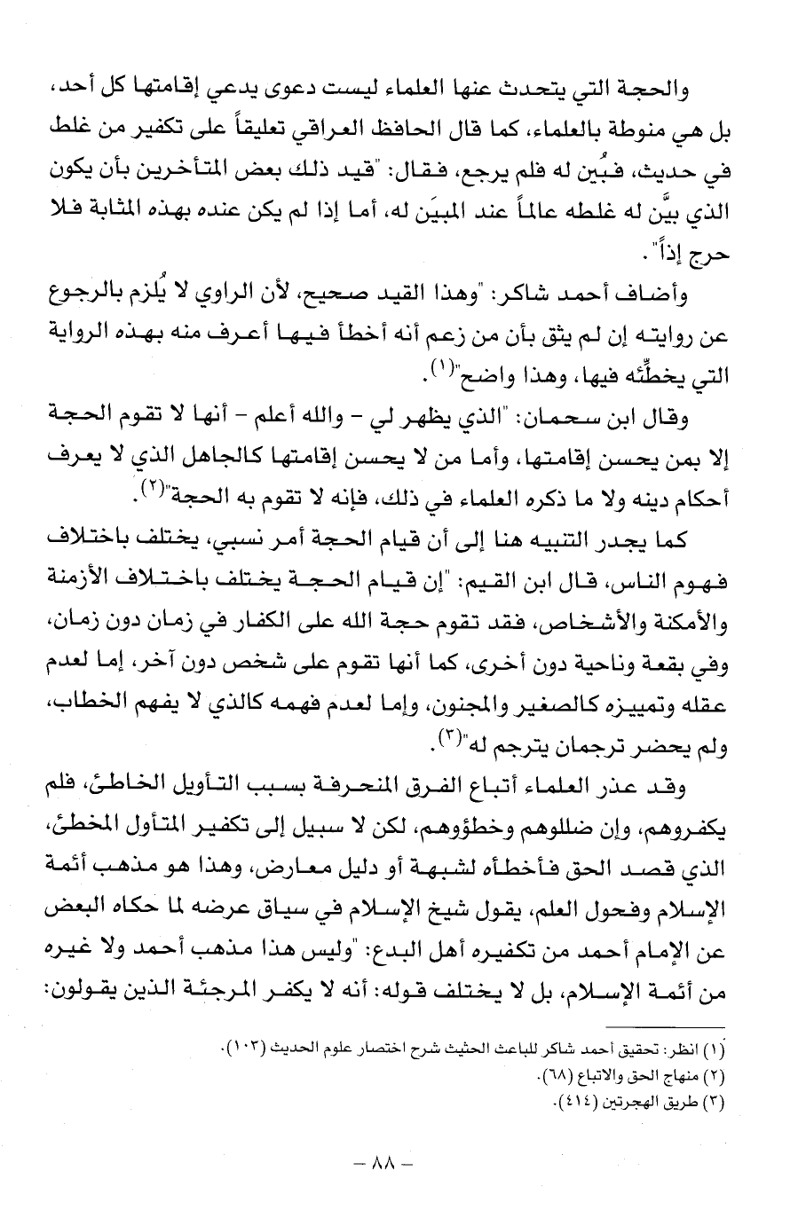 والحجة التي يتحدث عنها العلماء ليست دعوى يدعي إقامتها كل أحد، بل هي منوطة بالعلماء، كما قال الحافظ العراقي تعليقاً على تكفير من غلط في حديث، فبُين له فلم يرجع، فقال: "قيد ذلك بعض المتأخرين بأن يكون الذي بيَّن له غلطه عالماً عند المبيَن له، أما إذا لم يكن عنده بهذه المثابة فلا حرج إذاً".