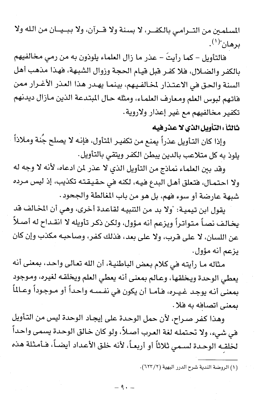 وإذا كان التأويل عذراً يمنع من تكفير المتأول، فإنه لا يصلح جُنة وملاذاً يلوذ به كل متلاعب بالدين يبطن الكفر ويتقي بالتأويل.