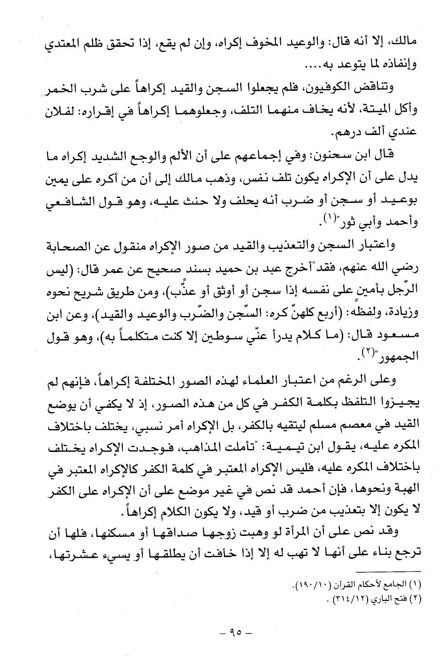 وعلى الرغم من اعتبار العلماء لهذه الصور المختلفة إكراهاً، فإنهم لم يجيزوا التلفظ بكلمة الكفر في كل من هذه الصور، إذ لا يكفي أن يوضع القيد في معصم مسلم ليتقيه بالكفر، بل الإكراه أمر نسبي، يختلف باختلاف المكره عليه، يقول ابن تيمية: "تأملت المذاهب، فوجدت الإكراه يختلف باختلاف المكره عليه، فليس الإكراه المعتبر في كلمة الكفر كالإكراه المعتبر في الهبة ونحوها، فإن أحمد قد نص في غير موضع على أن الإكراه على الكفر لا يكون إلا بتعذيب من ضرب أو قيد، ولا يكون الكلام إكراهاً.