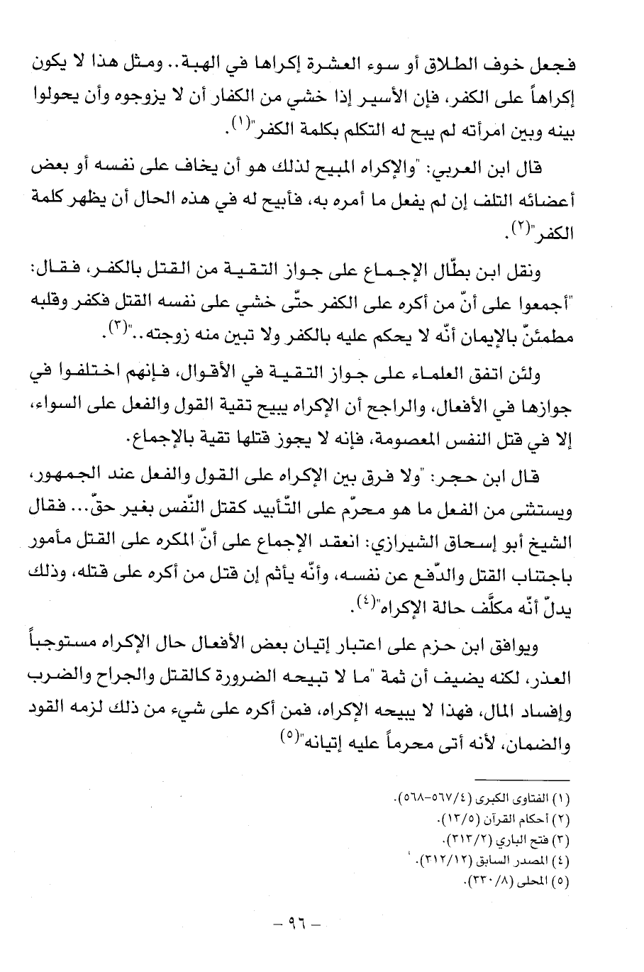 قال ابن حجر: " ولا فرق بين الإكراه على القول والفعل عند الجمهور , ويستثنى من الفعل ما هو محرّم على التّأبيد كقتل النّفس بغير حقّ ... فقال الشيخ أبو إسحاق الشيرازي: انعقد الإجماع على أنّ المكره على القتل مأمور باجتناب القتل والدّفع عن نفسه، وأنّه يأثم إن قتل من أكره على قتله , وذلك يدلّ أنّه مكلََّف حالة الإكراه ". (¬4)