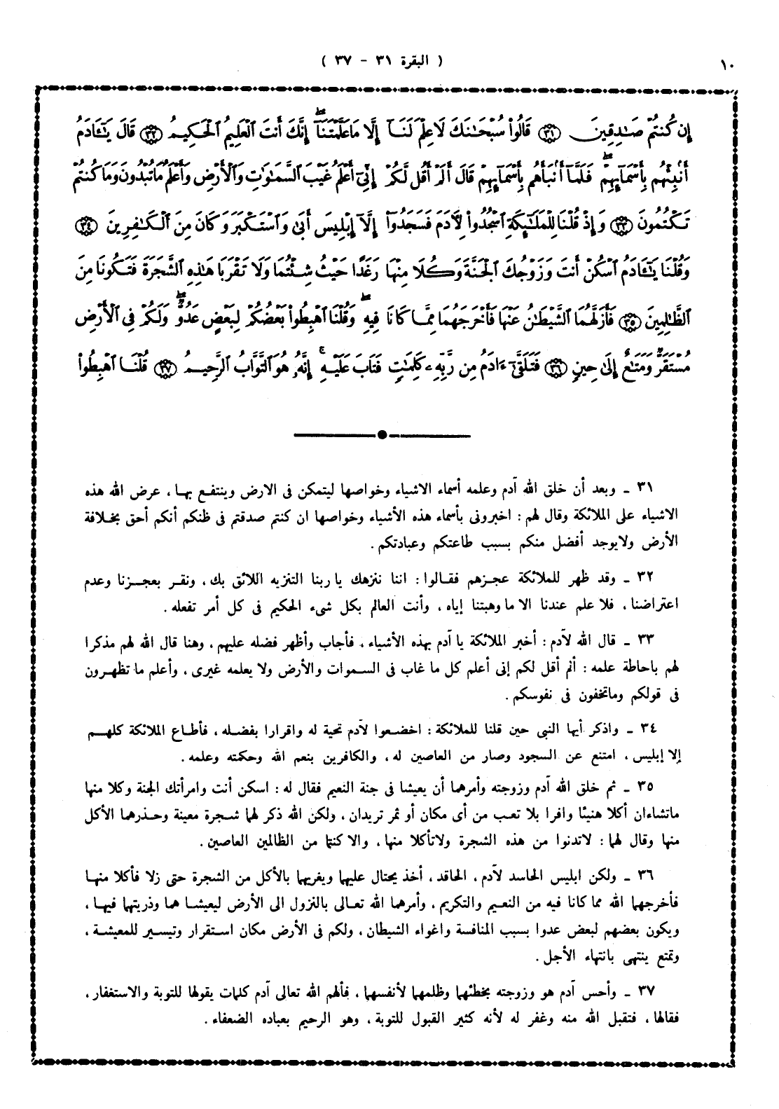 31 - وبعد أن خلق الله آدم وعلَّمه أسماء الأشياء وخواصَّها ليتمكن فى الأرض وينتفع بها، عرض الله هذه الأشياء على الملائكة وقال لهم: أخبرونى بأسماء هذه الأشياء وخواصها إن كنتم صدقتم فى ظنكم أنكم أحق بخلافة الأرض ولا يوجد أفضل منكم بسبب طاعتكم وعبادتكم.