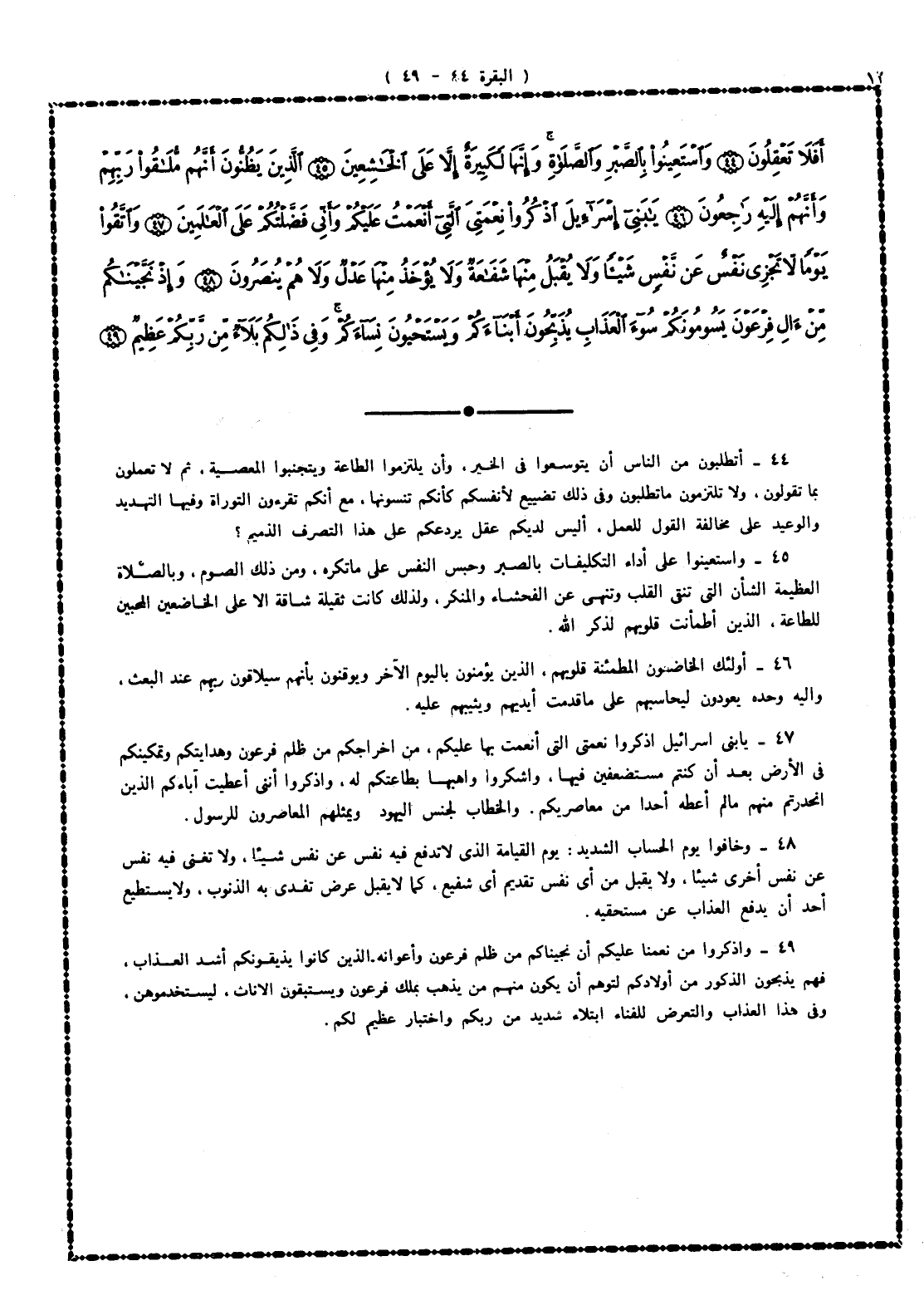 44 - أتطلبون من الناس أن يتوسعوا فى الخير، وأن يلتزموا الطاعة ويتجنبوا المعصية، ثم لا تعملون بما تقولون، ولا تلتزمون بما تطلبون؟ ، وفى ذلك تضييع لأنفسكم كأنكم تنسونها، مع أنكم تقرءون التوراة وفيها التهديد والوعيد على مخالفة القول للعمل، أليس لديكم عقل يردعكم عن هذا التصرف الذميم؟