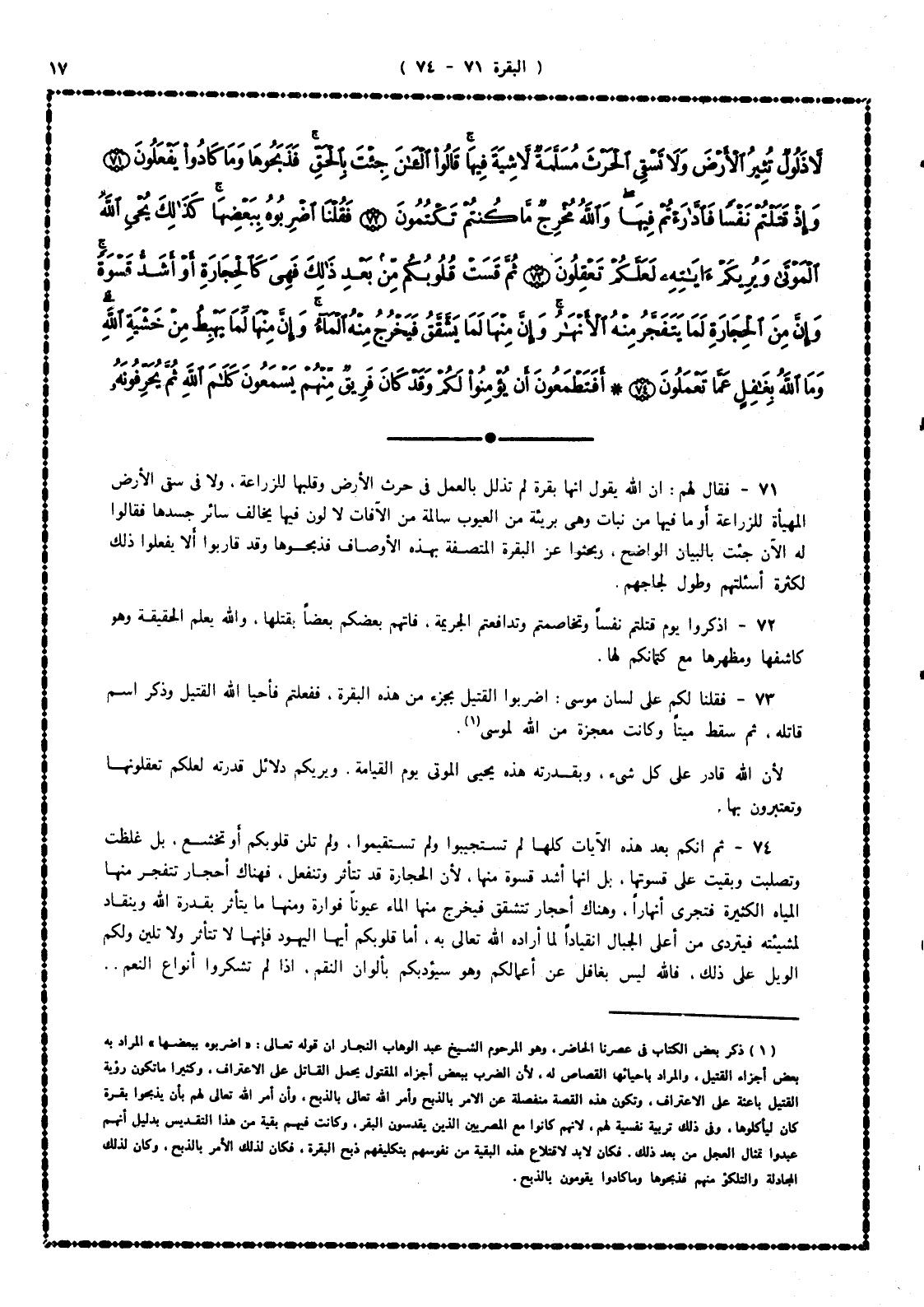 71 - فقال لهم: إن الله يقول إنها بقرة لم تذلل بالعمل فى حرث الأرض وقلبها للزراعة، ولا فى سقى الأرض المهيأة للزراعة أو ما فيها من نبات، وهى بريئة من العيوب، سالمة من الآفات، لا لون فيها يخالف سائر جسدها، فقالوا له: الآن جئت بالبيان الواضح، وبحثوا عن البقرة المتصفة بهذه الأوصاف فذبحوها، وقد قاربوا ألا يفعلوا ذلك لكثرة أسئلتهم وطول لجاجهم.